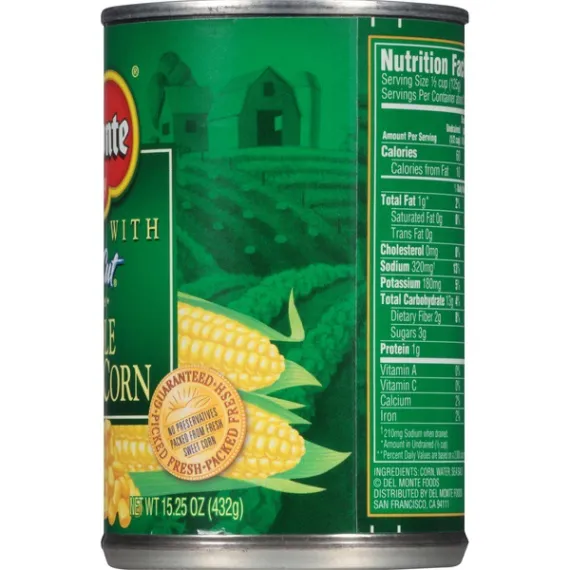 Details Ingredients Corn, Water, Sea Salt. Product features Del Monte Whole Kernel Corn 15.25 oz Del Monte Golden Sweet Corn Whole Kernel, 15.25 Oz Special Features Pull top Net Quantity of Content 3.5 X 1/2 cup undrained (125g)