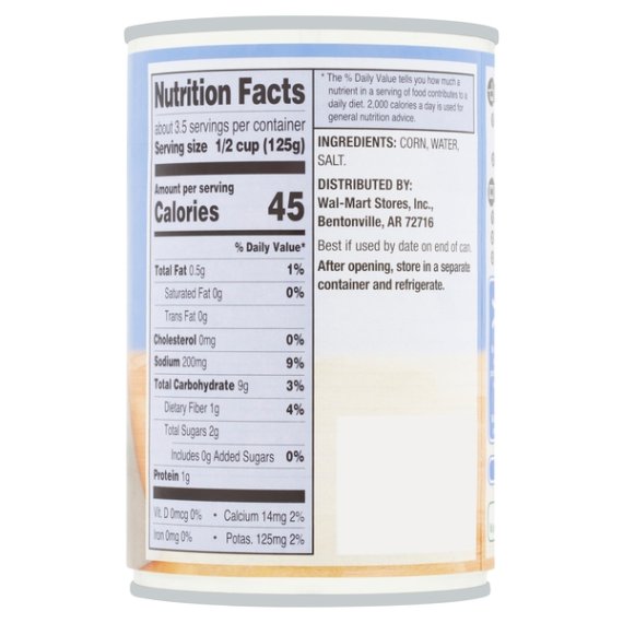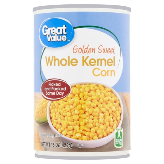 Details Ingredients CORN, WATER, SALT. Product features Take your culinary creations to the next level with Great Value Golden Sweet Whole Kernel Corn. This incredibly versatile vegetable is an excellent accompaniment to a variety of dishes including yummy tacos, burritos, relish, salsa, chowder, and more! Our sweet whole kernel corn is picked and packed the same day, so you know you're getting the highest quality produce. Our Great Value Golden Sweet Whole Kernel Corn has earned our esteemed Good For You label, which means it has met rigorous nutrition criteria informed by the latest nutrition science and authoritative guidance from the 2010 Dietary Guidelines for Americans, U.S. Food and Drug Administration (FDA), U.S. Department of Agriculture (USDA), and Institute of Medicine (IOM). Get creative in the kitchen and enjoy the incredible taste of Great Value Golden Sweet Whole Kernel Corn in your next recipe. Great Value products provide families with affordable, high quality grocery and household consumable options. With our wide range of product categories spanning grocery and household consumables, we offer you a variety of products for your family's needs. Our products are conveniently available online and in Walmart stores nationwide, allowing you to stock up and save money at the same time. Golden sweet whole kernel corn Picked and packed same day Great for you No cholesterol Gluten-free Special Features Whole kernel Net Quantity of Content ABOUT 3.5 X 0.5 cup