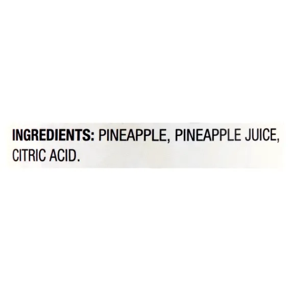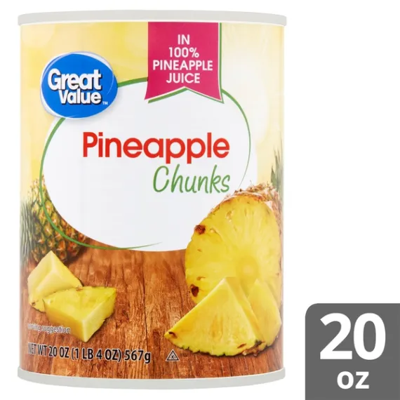 Details Ingredients PINEAPPLE, PINEAPPLE JUICE, CITRIC ACID. Product features Enjoy a healthy snack anytime with Great Value Pineapple Chunks. Our pineapple chunks are served in 100% pineapple juice with no added sugars, making them a healthier option than fruit soaked in heavy syrup. One serving will only set you back 70 calories, and with no fat or cholesterol, you know you're making a wholesome choice. Just pull the easy-open tab, no can opener required, and enjoy! Great Value Pineapple Chunks are a tasty treat you'll look forward to every day. Great Value products provide families with affordable, high quality grocery and household consumable options. With our wide range of product categories spanning grocery and household consumables, we offer you a variety of products for your family's needs. Our products are conveniently available online and in Walmart stores nationwide, allowing you to stock up and save money at the same time. Pineapple chunks in 100% pineapple juice Zero saturated or trans fats No cholesterol No added sugars 70 calories per serving Gluten free Net weight: 20oz Special Features Chunks Net Quantity of Content ABOUT 4 X 1/2 cup