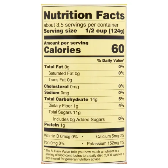 Details Ingredients PEACHES, WATER, PEACH PULP AND JUICE, PEAR JUICE CONCENTRATE, ASCORBIC ACID (VITAMIN C) TO PROTECT COLOR, CITRIC ACID. Show more Product features Yellow Cling Peaches in 100% Juice Enjoy the sweet and juicy flavor of sliced peaches inside every can of Great Value Sliced Peaches in 100% Juice. Peaches are known to contain a hefty amount of the healthy antioxidant vitamin C, and may also reduce LDL cholesterol associated with cardiovascular disease. Our mouth-watering peaches have absolutely no fat, sodium, or cholesterol, and only contain 60 calories per ½ cup serving, making them an excellent choice for the health-conscious consumer. These sliced peaches have earned our esteemed Good For You label, which means they have met rigorous nutrition criteria informed by the latest nutrition science and authoritative guidance from the 2010 Dietary Guidelines for Americans, U.S. Food and Drug Administration (FDA), U.S. Department of Agriculture (USDA), and Institute of Medicine (IOM). For a wholesome treat anytime, choose our Great Value Sliced Peaches in 100% Juice. Great Value products provide families with affordable, high quality grocery and household consumable options. With our wide range of product categories spanning grocery and household consumables, we offer you a variety of products for your family's needs. Our products are conveniently available online and in Walmart stores nationwide, allowing you to stock up and save money at the same time. Sliced peaches Yellow cling peaches in 100% juice 0g fat No cholesterol No sodium Great for you Gluten-free Recyclable 15oz can Special Features Naturally gluten-free food Net Quantity of Content ABOUT 3.5 X 0.5 cup