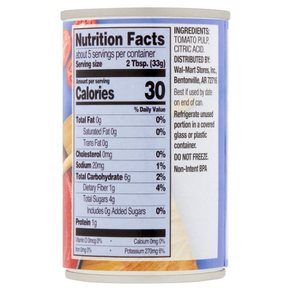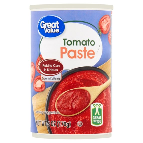 Details Ingredients TOMATO PULP, CITRIC ACID. Product features Give your homemade recipes an extra burst of flavor with Great Value Tomato Paste. Our juicy red tomatoes are grown in sunny California fields and canned within 5 hours of picking, so you know you're getting the freshest quality. Our tomato paste has also earned our esteemed “Great For You” label, which means it's packed with health benefits. One serving sets you back only 30 little calories, and with no sugar added, saturated fat, trans fat, or cholesterol, it is an excellent choice for your favorite home-cooked meals. Get creative in the kitchen with Great Value Tomato Paste. Great Value products provide families with affordable, high quality grocery and household consumable options. With our wide range of product categories spanning grocery and household consumables, we offer you a variety of products for your family's needs. Our products are conveniently available online and in Walmart stores nationwide, allowing you to stock up and save money at the same time. “Great For You” label designation No sugars added Zero saturated or trans fats No cholesterol 30 calories per serving Gluten free Net weight: 6oz Special Features 33 calories per serving Net Quantity of Content ABOUT 5 X 2 Tbsp