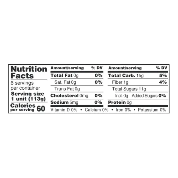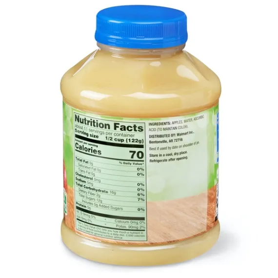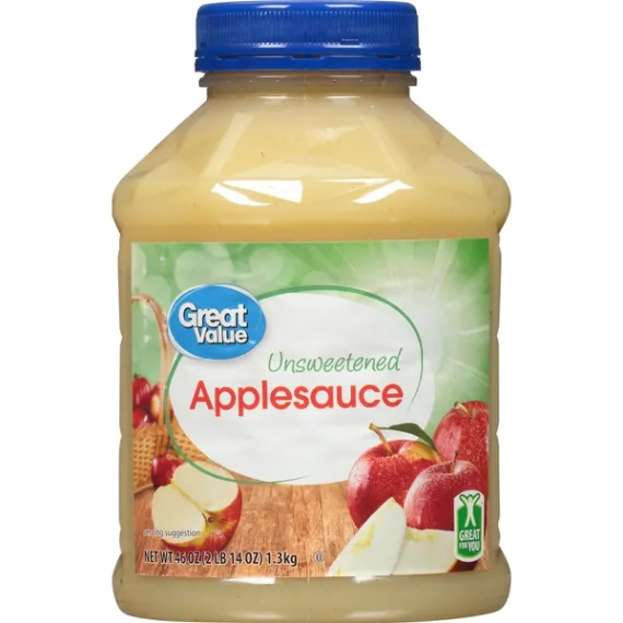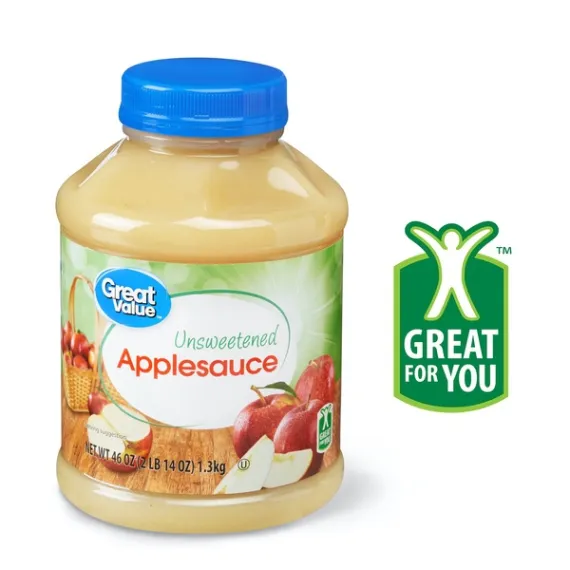 Details Ingredients APPLES, WATER, ASCORBIC ACID (VITAMIN C) Product features Great Value Natural Unsweetened Applesauce celebrates the taste of apples without any sugar or high-fructose corn syrup added. It provides 100 percent of vitamin C, and it is a good source of fiber. Enjoy it by itself or served with favorite dishes. You can also blend it into homemade muffin mixes. For kids, Great Value applesauce is a wholesome, after-school snack. Great Value products provide families with affordable, high quality grocery and household consumable options. With our wide range of product categories spanning grocery and household consumables, we offer you a variety of products for your familyâs needs. Our products are conveniently available online and in Walmart stores nationwide, allowing you to stock up and save money at the same time. Great Value Unsweetened Applesauce, 46 oz: Fresh and light snack or side dish No high fructose corn syrup or sugar Enough for the whole family Great baking alternative Special Features All natural Net Quantity of Content 11 X 1/2 cup (122g)