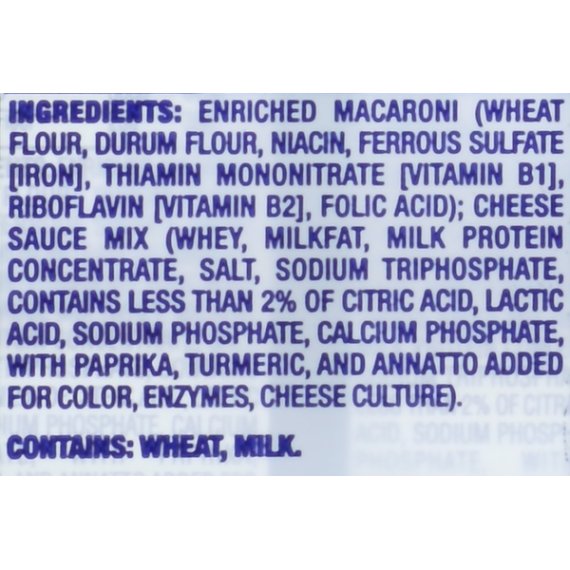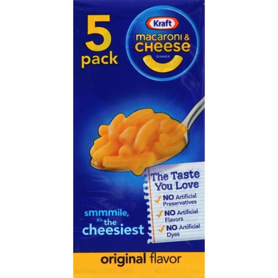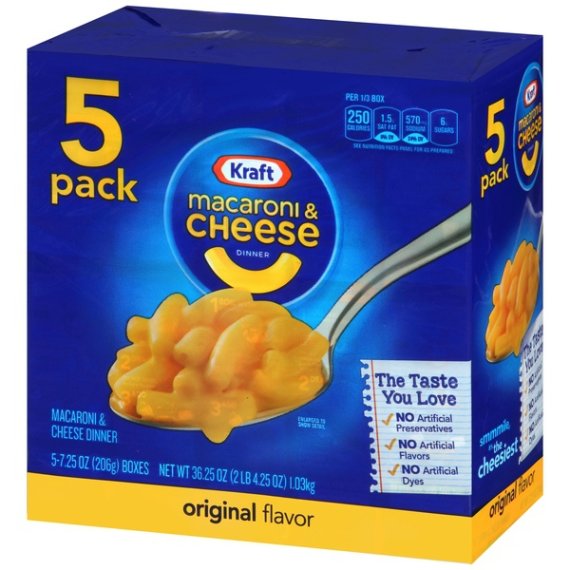 Details Ingredients Ingredients: Enriched Macaroni (Wheat Flour, Durum Flour, Niacin, Ferrous Sulfate [Iron], Thiamin Mononitrate [Vitamin B1], Riboflavin [Vitamin B2], Folic Acid); Cheese Sauce Mix (Whey, Milkfat, Milk Protein Concentrate, Salt, Sodium Triphosphate, Contains Less Than 2% Of Citric Acid, Lactic Acid, Sodium Phosphate, Calcium Phosphate, With Paprika, Turmeric, And Annatto Added For Color, Enzymes, Cheese Culture). Show more Product features Kraft Original Flavor Mac and Cheese is a convenient boxed dinner. Kids and adults love the rich taste of mac with cheesy goodness. This handy dinner includes macaroni noodles and original flavor cheese sauce mix, so you just need milk and margarine or butter to make a tasty family meal or a quick dinner for kids. With no artificial flavors, no artificial preservatives and no artificial dyes, boxed mac and cheese is always a great family dinner choice. Preparing mac and cheese is a breeze just boil the noodles for 7-8 minutes, drain the water and stir in the cheese mix, milk and margarine or butter. This 36.25 ounce pack includes five 7.25 ounce boxes of mac and cheese. Now you can have your Kraft Mac and Cheese and eat it, too. Five 7.25 oz. boxes of Kraft Original Flavor Macaroni and Cheese Kraft Original Flavor Macaroni and Cheese is a convenient boxed dinner Box includes macaroni noodles and original flavor cheese sauce mix Contains no artificial flavors, no artificial preservatives and no artificial dyes One box makes 3 servings Boxed macaroni and cheese is a quick and easy dinner Macaroni noodles and cheese sauce mix are individually sealed Net Quantity of Content 15.0 X 2.5 oz (70g / about 1/3 Box) (Makes about 1 cup)
