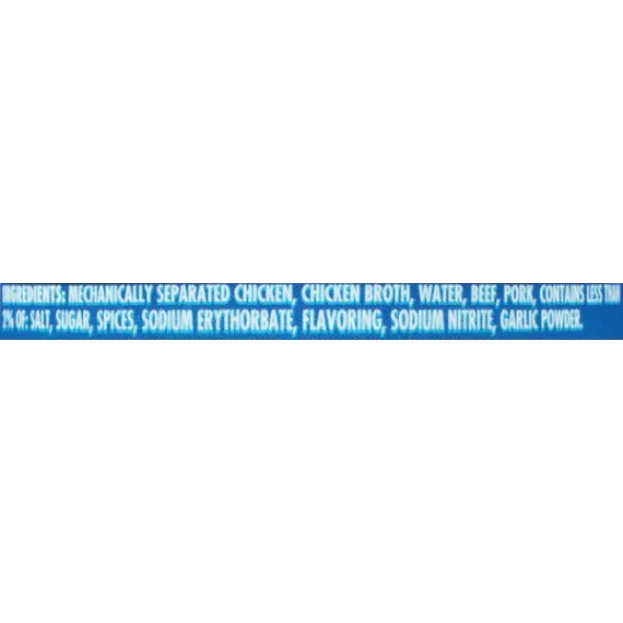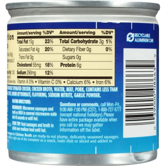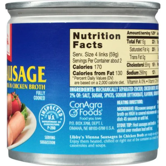 Details Ingredients Mechanically Separated Chicken, Chicken Broth, Water, Beef, Pork, Contains less than 2% of: Salt, Sugar, Spices, Sodium Erythorbate, Flavoring, Sodium Nitrite, Garlic Powder. Show more Product features Libby's Chicken Vienna Sausage in Chicken Broth make a fantastic snack or can help add flavor to your favorite recipes. Great for casseroles, soups, or classic mac and cheese. Fully cooked, plump, and delicately seasoned Chicken Vienna Sausage have 8 g of protein per serving. Libby's is one of the most well-known brands of quality products with a long tradition in the United States. One 4.6 oz. can of Libby's Chicken Vienna Sausage in Chicken Broth Plump, delicately seasoned sausage snacks are ready to eat Slice into casseroles, soups, and your other favorite recipes Made with chicken broth Fully cooked sausage bites are a great snack 6 g protein per serving 140 calories per serving Net Quantity of Content 2.0 X 59g