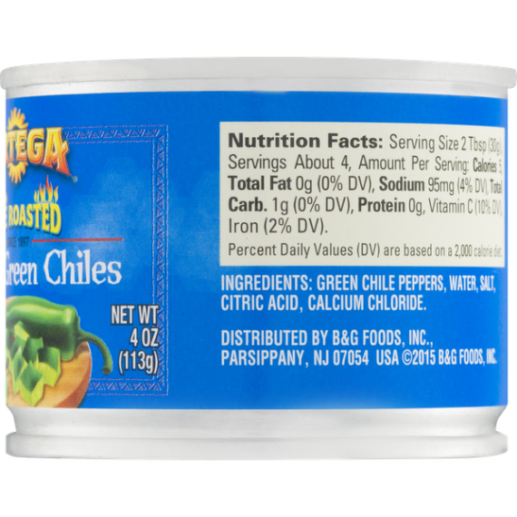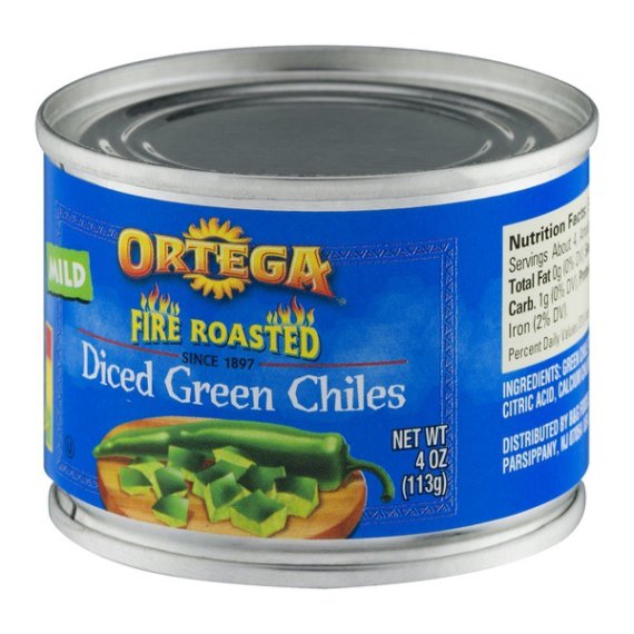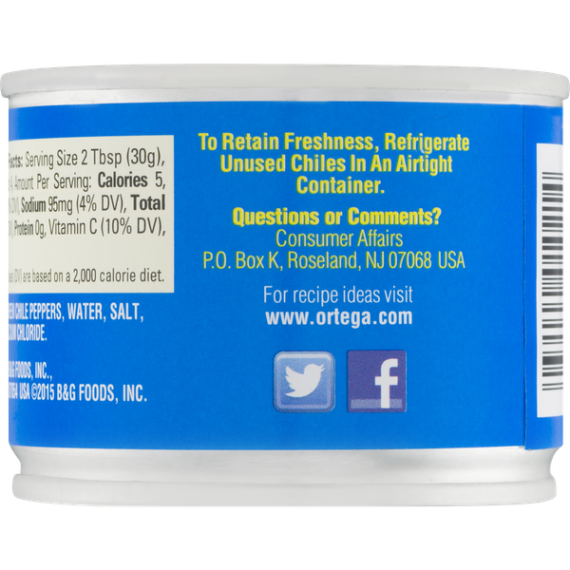 Details Ingredients Green Chiles, Salt, Citric Acid, Calcium Chloride. Product features Ortega Diced Green Chiles available in a 4-oz can are sure to spice up any meal. Ortega has made the original fire-roasted green chile since 1897. These canned green chiles have been fire-roasted for the fullest flavor. Their signature roasting process piques the flavor for an authentic Mexican taste. It contains simple ingredients to add a spicy yet delicious flavor to any traditional dish. Add this to many of your favorite recipes for flavor. Each serving only contains 10 calories. It contains nutrients such as iron, vitamin C and protein to add to a well-balanced diet. Simply stir it in while cooking, and in no time you will have a mouth-watering meal the whole family will enjoy. Each can contains enough to serve at least four people. Ortega Diced Green Chiles, 4 oz: America's favorite Kosher Ortega green chiles Special Features Diced Net Quantity of Content About 4 X 30 g