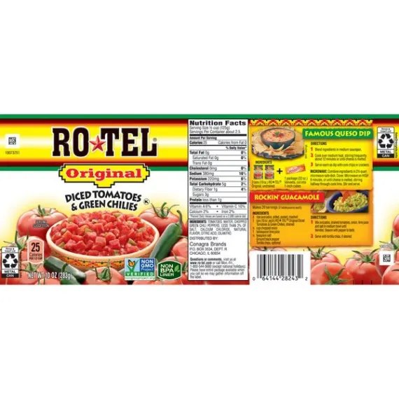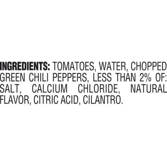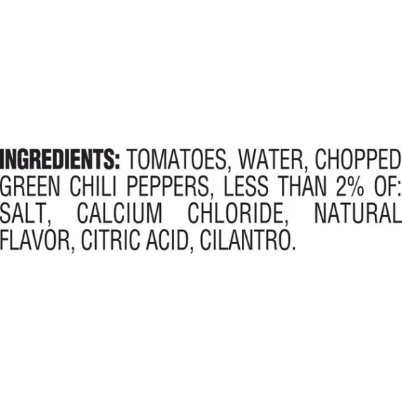 Details Ingredients Tomatoes, Water, Chopped Green Chili Peppers, Less than 2% of: Salt, Calcium Chloride, Natural Flavor, Citric Acid, Cilantro. Product features Take your favorite recipe to a bold new level with RO*TEL Original Diced Tomatoes and Green Chilies. Vine-ripened tomatoes, zesty green chilies, and a mix of spices are what give RO*TEL Original Diced Tomatoes and Green Chilies its unique zesty fresh-from-the-vine taste. Combine RO*TEL Original Diced Tomatoes and Green Chilies with soups, chili, queso, or any other recipe, and banish the bland. Make chili night memorable with RO*TEL Original Diced Tomatoes and Green Chilies. RO*TEL Original Diced Tomatoes and Green Chilies contains 25 calories per serving. Don't make compromises with your meals. Embrace the bold with the fresh taste of RO*TEL, the Bite with Bite. Take your favorite recipe to a bold new level with RO*TEL Original Diced Tomatoes and Green Chilies Vine-ripened tomatoes, zesty green chilies, and a mix of spices are what give RO*TEL Original Diced Tomatoes and Green Chilies its unique zesty fresh-from-the-vine taste Combine RO*TEL Original Diced Tomatoes and Green Chilies with soups, chili, queso, or any other recipe, and banish the bland Make chili night memorable with RO*TEL Original Diced Tomatoes and Green Chilies RO*TEL Original Diced Tomatoes and Green Chilies contains 25 calories per serving Special Features With green chilis Net Quantity of Content 2.5 X 125g