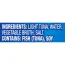 Details Ingredients LIGHT TUNA, WATER, VEGETABLE BROTH, SALT. Product features If you like your tuna without any additional flavors, StarKist Chunk Light Tuna in Water is what you need. These hand-packed select cuts come in a 5 oz can and promise flaky, firm and fresh tasting fish. It contains 90mg of DHA & EPA omega-3s per serving. The key ingredients are light tuna, water, vegetable broth, and salt. The product is American Heart Association certified and so meets the criteria for healthy heart food. StarKist tuna fish may contain bones. The serving size is 2.5 oz (drained) and servings per container is 2.0. It has a negligible amount of 5 calories from fat. Enjoy this delicious treat and keep your heart healthy too. StarKist Chunk Light Tuna in Water, 5.0 oz: 90mg of DHA & EPA omega-3s per serving Dolphin safe American Heart Association certified 100% wild caught Ingredients: light tuna, water, vegetable broth and salt Canned tuna fish may contain bones Serving size: 2.5 oz. drained Servings per container: 2.0 Calories from fat: 5 calories Special Features Natural source of omega-3 Net Quantity of Content 2 X 2 oz