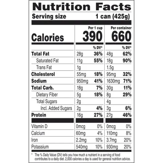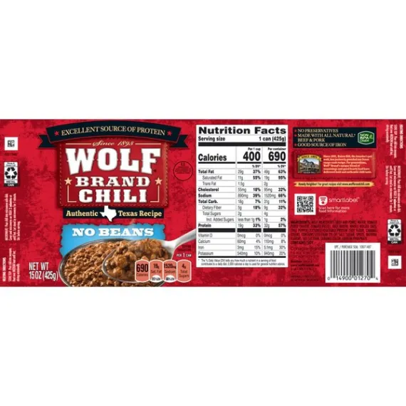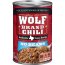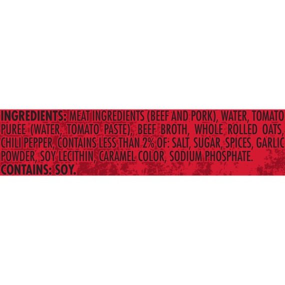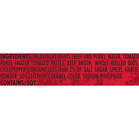Details Ingredients Meat Ingredients (Beef and Pork), Water, Tomato Puree (Water, Tomato Paste), Beef Broth, Whole Rolled Oats, Chili Pepper, Contains less than 2% of: Salt, Sugar, Spices, Garlic Powder, Soy Lecithin, Caramel Color, Sodium Phosphate. CONTAINS: SOY. Show more Product features Add the classic taste of chili to your next event menu with WOLF BRAND Chili No Beans in a 15-ounce can. The original, authentic Texas recipe dates back to 1895. Today, this canned chili is made with a unique blend of seasonings, hearty beef and delicious pork for a classic taste that all your guests will enjoy. This easy chili without beans can be added to casseroles or slow cooker recipes, or serve as a topping for a cheese dip, corn chip pie or more. Made with no preservatives and all-natural* beef and pork, WOLF BRAND canned chili con carne is an excellent source of iron per serving. Quickly heat up on the stovetop or in the microwave for a chili that's ready in minutes. WOLF BRAND Chili No Beans is your go-to choice for a bolder, thicker, heartier chili. *Minimally processed with no artificial ingredients Includes one 15-ounce can of WOLF BRAND Homestyle Chili Without Beans Made with vine-ripened tomato puree simmered with pork, ground beef and a kick of jalapeño flavor Excellent source of iron per serving with no preservatives Made with all-natural beef and pork that's been minimally processed with no artificial ingredients Prepare a can of WOLF BRAND Homestyle Chili With Beans on the stovetop or in the microwave to feed a crowd Special Features No beans Net Quantity of Content 1.0 X 248g