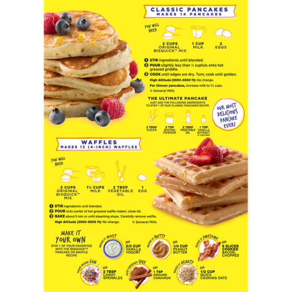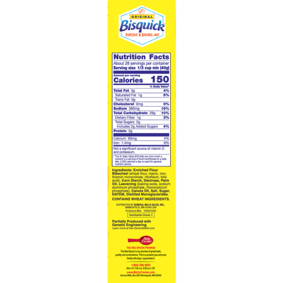 Details Ingredients Enriched Flour Bleached (Wheat Flour, Niacin, Iron, Thiamin Mononitrate, Riboflavin, Folic Acid), Corn Starch, Dextrose, Palm Oil, Leavening (Baking Soda, Sodium Aluminum Phosphate, Monocalcium Phosphate), Canola Oil, Salt, Sugar, Datem, Distilled Monoglycerides. Show more Product features Pancake mix makes fluffy, mouth-watering pancakes, waffles, and more. Quick and easy breakfast; just add water and pour onto griddle. Betty Crocker Bisquick Pancake & Baking Mix 40.0 oz Box. No Artificial Flavors; No Colors; Kosher Pancake mix makes fluffy, mouth-watering pancakes, waffles, and more Quick and easy breakfast; just add water and pour onto griddle Easy to personalize with fruits, nuts or chocolate chips Stock up your pantry with an easy and delicious breakfast option for everyone The Red Spoon is my promise of great taste, quality, and convenience; This is a product you and your family will enjoy, I guarantee it - Betty Crocker Special Features Pancake mix Net Quantity of Content 28 X 1/3 cup mix (40g)
