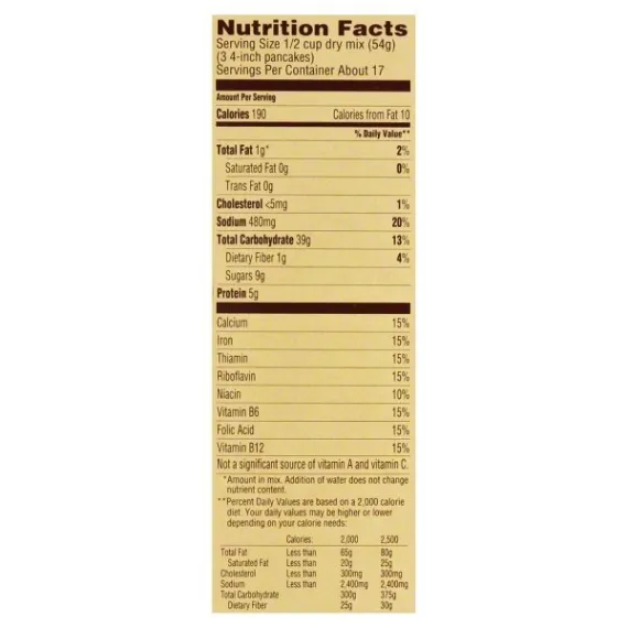 Details Ingredients Enriched Bleached Flour (Wheat Flour, Malted Barley Flour, Niacin, Iron, Thiamin Mononitrate, Riboflavin, Folic Acid), Sugar, Dextrose, Leavening (Baking Soda, Calcium Phosphate, Sodium Aluminum Phosphate), Buttermilk, Contains 2% Or Less Of: Salt, Canola Oil, Potassium Bicarbonate, Calcium Carbonate, Corn Starch, Yellow 5, Red 40, Iron, Niacin, Vitamin B6, Riboflavin, Thiamin Mononitrate, Folic Acid, Vitamin B12. Show more Product features It’s the classic buttermilk flavor you love in a complete, just-add-water mix. Hearty, delicious, and a good source of calcium and six vitamins plus iron. Just add water Good source of calcium & 6 vitamins plus iron Classic Buttermilk Flavor Net Quantity of Content 17.0 X 1/2 cup