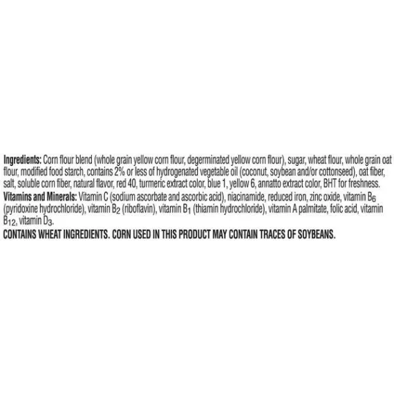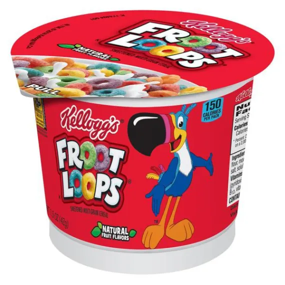 Details Ingredients Ingredients: Corn flour blend (whole grain yellow corn flour, degerminated yellow corn flour), sugar, wheat flour, whole grain oat flour, modified food starch, contains 2% or less of hydrogenated vegetable oil (coconut, soybean and/or cottonseed), oat fiber, salt, soluble corn fiber, natural flavor, red 40, turmeric extract color, blue 1, yellow 6, annatto extract color, BHT for freshness.Vitamins and Minerals: Vitamin C (sodium ascorbate and ascorbic acid), niacinamide, reduced iron, zinc oxide, vitamin B6 (pyridoxine hydrochloride), vitamin B2 (riboflavin), vitamin B1 (thiamin hydrochloride), vitamin A palmitate, folic acid, vitamin B12, vitamin D3. Show more Product features A fun part of any complete breakfast and bursting with fruity flavor, Kellogg’s Froot Loops is a delicious, sweetened cereal made with whole grains. An excellent source of 8 vitamins and minerals and a good source of fiber, Froot Loops is also low in fat. Made to help bring energy to your mornings, our colorful cold cereal makes for a tasty pick-me-up at school or work, as an afternoon bite, or late night treat. Individually sized and conveniently packaged, Kellogg’s Froot Loops Cereal Cups are an ideal companion for lunch boxes, after-school snacks, and busy, on-the-go moments. Just add your favorite dairy or nut-milk or enjoy as a crispy treat straight from the cup. • Includes 1, 1.5-ounce cup of single-serve ready-to-eat Froot Loops Cereal; Individually packaged for freshness and great taste • Bursting with fruity flavor, Kellogg’s Froot Loops is a delicious, sweetened cereal made with whole grains; A fun part of any balanced breakfast • Excellent source of 8 vitamins and minerals; Good source of fiber; 16 grams of whole grain per serving; Low Fat; Ingredients contain wheat; Corn used in this product may contain traces of soy • A classic, family-favorite cereal that's perfect for both kids and adults; Makes a delicious cold breakfast at home or school, midday bite at work, and after-dinner treat • Conveniently packaged and ready to travel; Great for backpacks and lunchboxes; Stow in your tote bag, car, and desk for anytime snacking Net Quantity of Content 12.0 X 42 g