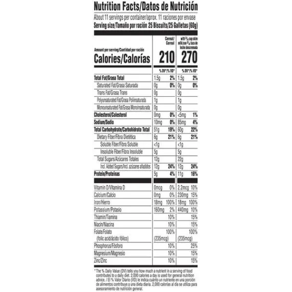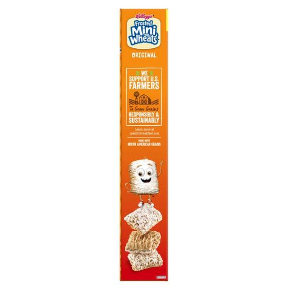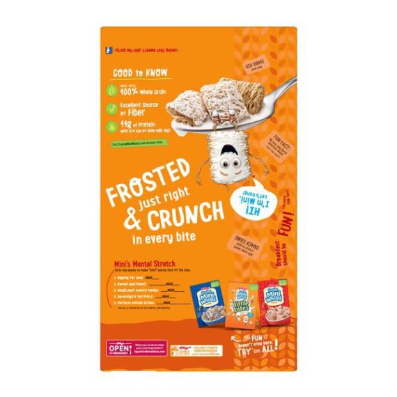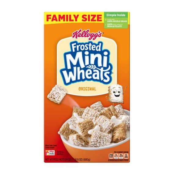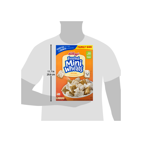 Details Ingredients Whole Grain Wheat, Sugar, Contains 2% or less of Brown Rice Syrup, Gelatin, BHT for Freshness. Product features Greet the day with Kellogg's Original Frosted Mini-Wheats—a wholesome, low fat breakfast cereal that's built for big days. These bite-size biscuits pack a hearty crunch with crispy layers of wheat made from 100% whole grain that are frosted with irresistible sweetness in every bite. With 48 grams of whole grain per serving, these tasty squares are not only delicious but are an excellent source of fiber. Each satisfying serving contains a feel-good mix of 7 essential vitamins and minerals to help fuel you for what's ahead. Kellogg's Frosted Mini-Wheats make a nutritious, anytime meal or snack. Enjoy wheat bites throughout the day—as a well-deserved snack at the office, an afternoon work pick-me-up, a post-workout treat, or a late-night bowlful of sweet, crunchy cereal. Frosted Mini-Wheats also make a scrumptious addition to homemade trail mix. A travel-ready food, this cereal is perfect to pack for lunchboxes, after-school snacks, sporting events, and busy, on-the-go moments. Kellogg's Original Frosted Mini-Wheats are a great start to your morning breakfast routine and for the adventures that follow. Kellogg's Frosted Mini-Wheats Breakfast Cereal 24 Oz Crunchy, bite-sized wheat biscuits with the irresistible taste of sweet frosting in every satisfying spoonful Start your day off right with the fortifying goodness of wheat biscuits made with 100% whole grain and delicious frosting With 48 grams of whole grain, an excellent source of fiber, and a good source of 7 essential vitamins and minerals per serving; No artificial flavors or colors; No high fructose corn syrup A low fat, family-favorite cereal that's sure to please both kids and adults; Enjoy with or without your favorite milk; Makes a tasty snack at work, school, or as a late-night treat Includes 1, 24-ounce box of delicious Frosted Mini-Wheats cereal; Convenient, ready-to-eat cereal packaged for freshness and great taste Special Features Bite size Net Quantity of Content 12 X 21.0