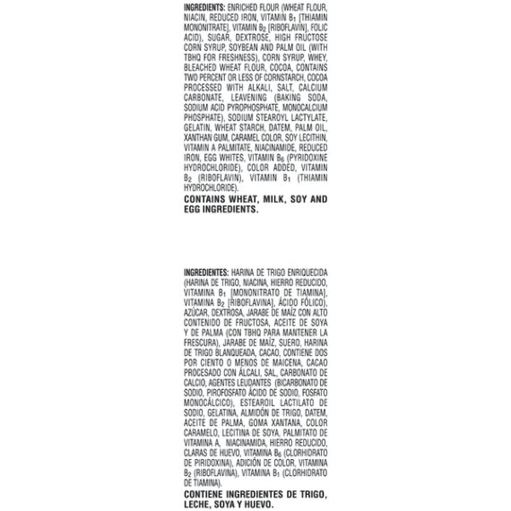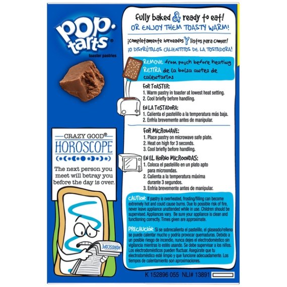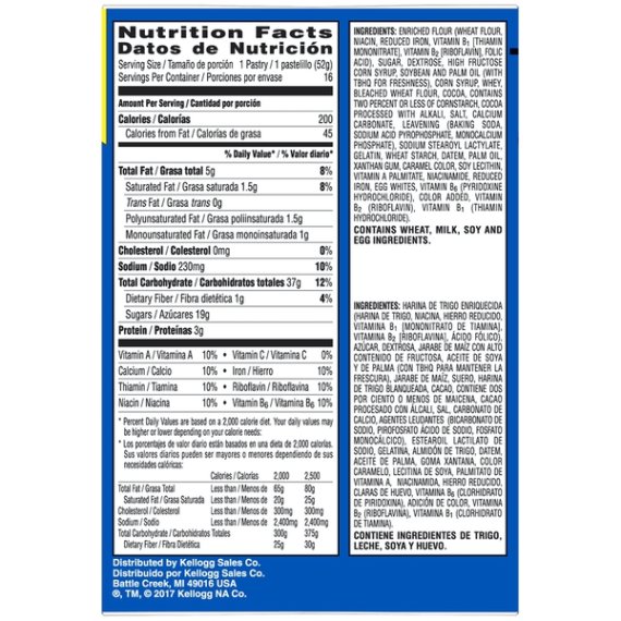 Details Ingredients ENRICHED FLOUR (WHEAT FLOUR, NIACIN, REDUCED IRON, VITAMIN B1 [THIAMIN MONONITRATE], VITAMIN B2 [RIBOFLAVIN], FOLIC ACID), SUGAR, DEXTROSE, SOYBEAN AND PALM OIL (WITH TBHQ FOR FRESHNESS), CORN SYRUP, WHEY, CRACKER MEAL, HIGH FRUCTOSE CORN SYRUP, COCOA, CONTAINS TWO PERCENT OR LESS OF CORNSTARCH, COCOA (PROCESSED WITH ALKALI), SALT, CALCIUM CARBONATE, LEAVENING (BAKING SODA, SODIUM ACID PYROPHOSPHATE, MONOCALCIUM PHOSPHATE), MODIFIED CORN STARCH, MONO- AND DIGLYCERIDES, SODIUM STEAROYL LACTYLATE, GELATIN, EGG WHITES, DATEM, SOYBEAN OIL, XANTHAN GUM, CARAMEL COLOR, SOY LECITHIN, COLOR ADDED, VANILLA EXTRACT, VITAMIN A PALMITATE, NIACINAMIDE, REDUCED IRON, VITAMIN B6 (PYRIDOXINE HYDROCHLORIDE), VITAMIN B2 (RIBOFLAVIN), VITAMIN B1 (THIAMIN HYDROCHLORIDE). Show more Product features Pop-Tarts Frosted Chocolate Fudge toaster pastries are a delicious treat to look forward to. Jump-start your day with a gooey, chocolate fudge-flavored center encased in a crumbly, chocolatey pastry crust and topped with sweet, decadent frosting. A quick and tasty anytime snack for the whole family, Kelloggâs Pop-Tarts toaster pastries are an ideal companion for lunch boxes, after-school snacks, and busy, on-the-go moments. Just pop them in your toaster or enjoy them right out of the pouch with a glass of ice-cold milk. Soft toaster pastries with the flavor of chocolate fudge and delicious frosting with crunchy sprinkles; Sweet, fully baked, and ready to eat Start your day with crumbly, chocolatey pastry crust and chocolate fudge-flavored filling; A delicious, family-favorite morning treat; Great for kids and adults Contains 0 grams trans fat; A fun part of any balanced breakfast at home or on-the-go; Enjoy them warm or fresh out of the pack A travel-ready food; Makes a tasty snack at work, afternoon pick me up at school, or late night treat; Stow in lunch boxes, totes, and backpacks Includes 1, 29.3-ounce value-sized box containing 16 toaster pastries; 8 packages total, 2 pastries per package; Packaged for freshness and great taste Special Features Family pack Net Quantity of Content 16 X 52 g