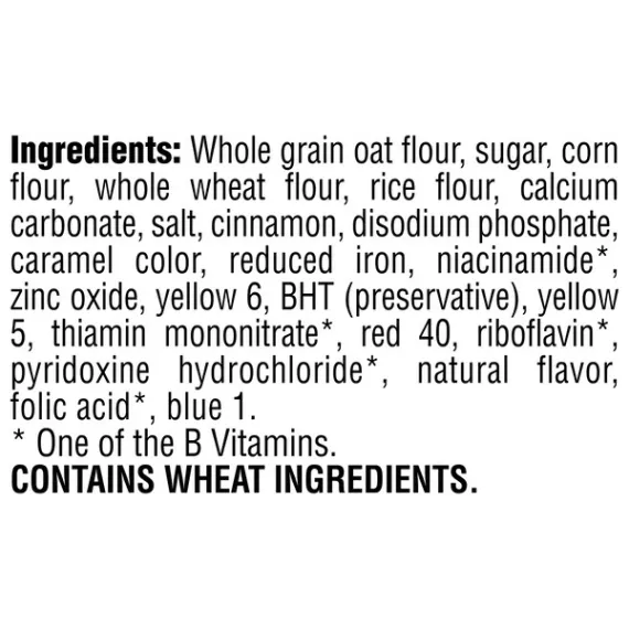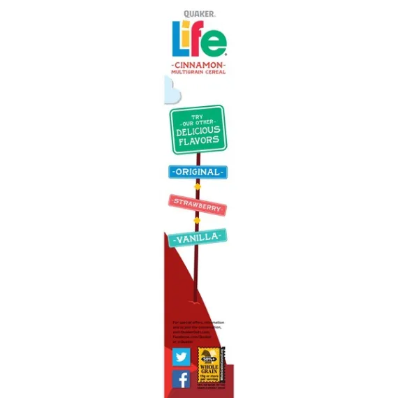 Details Ingredients WHOLE GRAIN OAT FLOUR, SUGAR, CORN FLOUR, WHOLE WHEAT FLOUR, RICE FLOUR, CALCIUM CARBONATE, SALT, CINNAMON, DISODIUM PHOSPHATE, CARAMEL COLOR, REDUCED IRON, NIACINAMIDE*, ZINC OXIDE, YELLOW 6, BHT (A PRESERVATIVE), YELLOW 5, THIAMIN MONONITRATE*, RED 40, RIBOFLAVIN*, PYRIDOXINE HYDROCHLORIDE*, NATURAL FLAVOR, FOLIC ACID*, BLUE 1. Show more Product features Attention Life Cereal lovers there's room for two loves in your life. We've spiced up your favorite cereal with the lively taste of cinnamon. Enjoy the wholesome sweetness of Quaker Life Cereal and cinnamon made with whole grain Quaker Oats, and start your day off right. Quaker Life Cinnamon Cereal satisfies the kid in everyone with just the right touch of sweetness and crispy goodness. Excellent source of B vitamins to help convert food into energy. 18 grams of whole grains per serving. Quaker Life Cinnamon cereal helps promote healthy hearts. Special Features No Net Quantity of Content 16 X 0.75 cup
