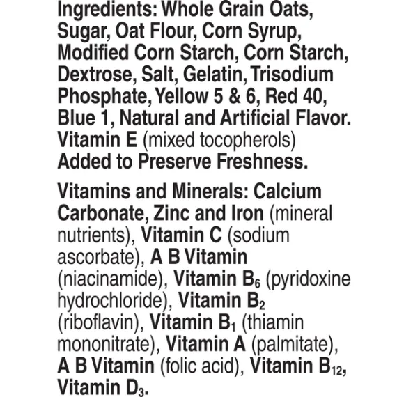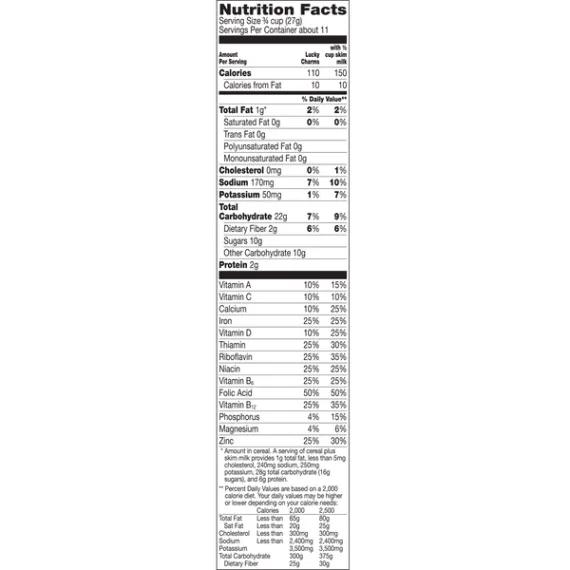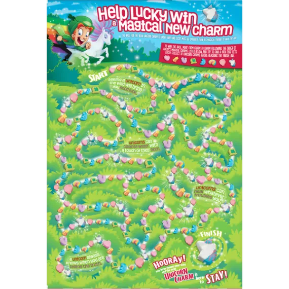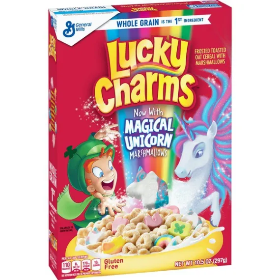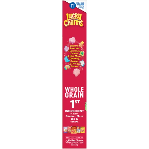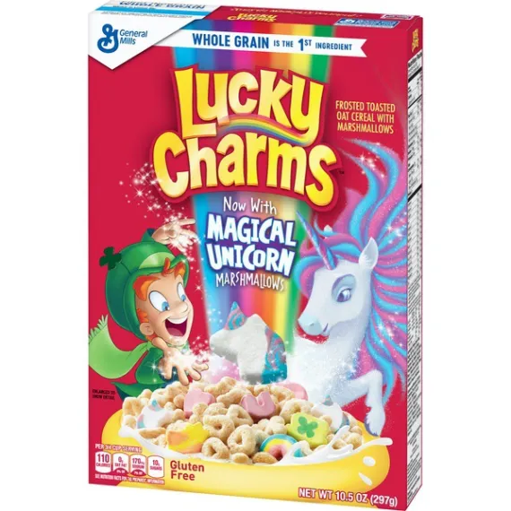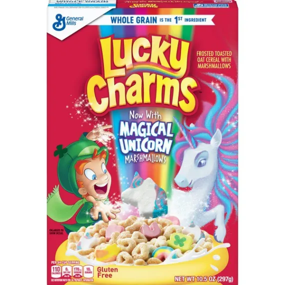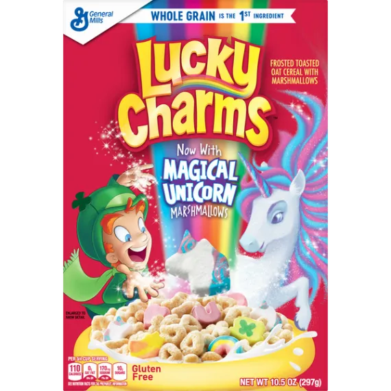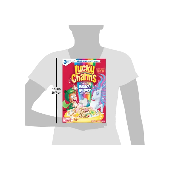 Details Ingredients Whole Grain Oats, Sugar, Oat Flour, Corn Syrup, Modified Corn Starch, Corn Starch, Dextrose, Salt, Gelatin, Trisodium Phosphate, Yellow 5 & 6, Red 40, Blue 1, Natural and Artificial Flavor. Vitamin E (Mixed Tocopherols) Added to Preserve Freshness. Show more Product features Magically delicious Lucky Charms cereal features frosted oats and colored marshmallows. Made with 11g of whole grain per Serving; And it's Gluten Free! Lucky Charms Cereal is a delicious breakfast cereal for the entire family to enjoy Fun flavors and shapes kids and adults will love Contains whole grains for a well rounded meal Enjoy the flavors with milk or by itself for a school snack A pantry staple for breakfast that's a sweet, crunch cereal Breakfast Cereal; Cold Cereal; Lucky Charm; General Mills Cereal; Marshmallow Cereal; Unicorns Net Quantity of Content 11 X 3/4 cup (27g)