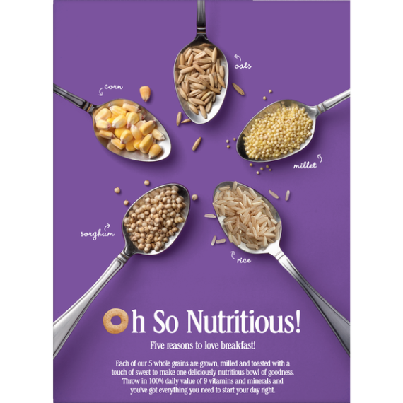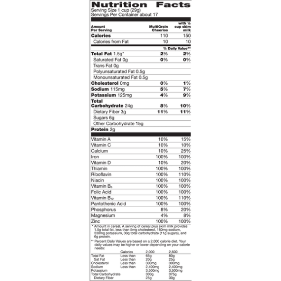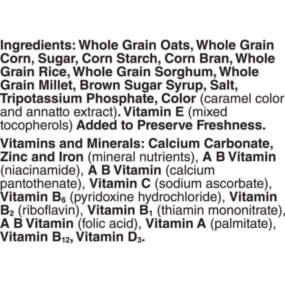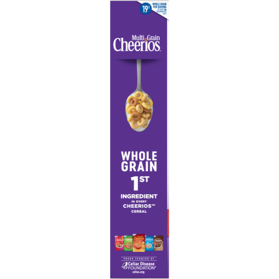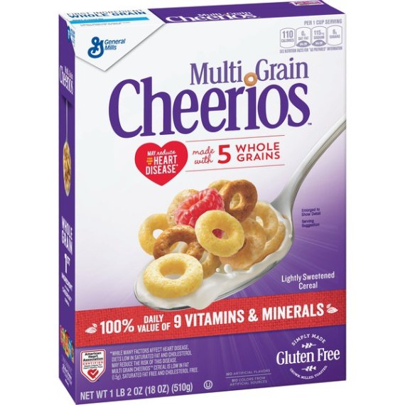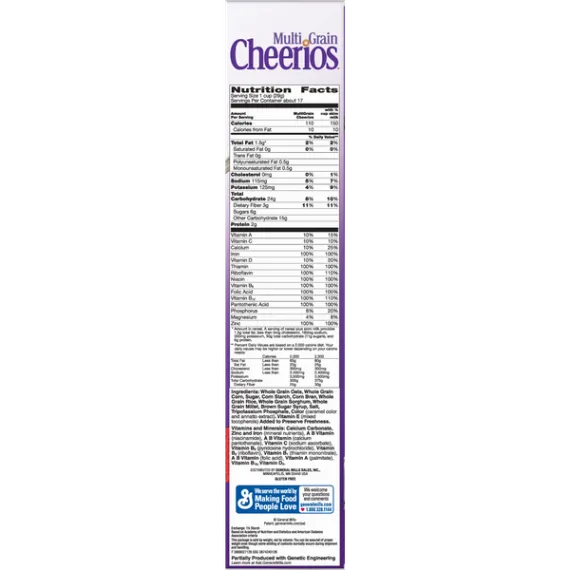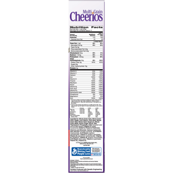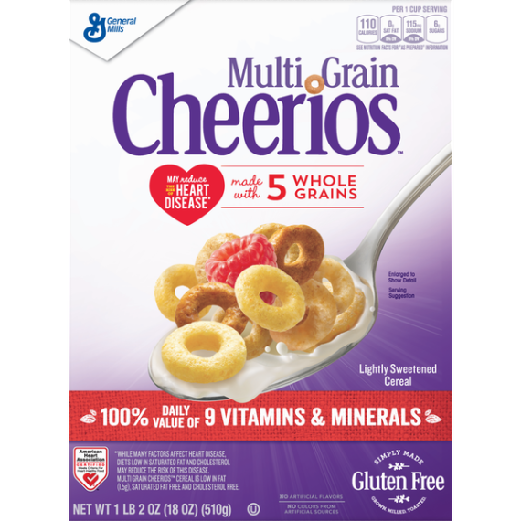 Details Ingredients Whole Grain Oats, Whole Grain Corn, Sugar, Corn Starch, Corn Bran, Whole Grain Rice, Whole Grain Sorghum, Whole Grain Millet, Brown Sugar Syrup, Salt, Tripotassium Phosphate, Color (Caramel Color and Annatto Extract). Vitamin E (Mixed Tocopherols) Added to Preserve Freshness. Show more Product features Multi Grain Cheerios has No High Fructose Corn Syrup, No Artificial Flavors, No Colors From Artificial Sources and is Gluten Free! With 19g Whole grain per serving, Multi Grain Cheerios is a delicious breakfast cereal for the entire family to enjoy. O So Nutritious! Five reasons to love breakfast! Each of our 5 whole grains are grown, milled and toasted with just the right amount of sweetness to make one deliciously nutritious bowl of goodness. Throw in 100% daily value of 9 vitamins and minerals and you’ve got everything you need to start your day right. CEREAL: Wholesome multi grain breakfast with just the right amount of sweetness; Contains 100% Daily Value of 9 Vitamins and Minerals and is a good source of fiber GLUTEN FREE: Gluten free and simply made with 5 whole grains; Contains no artificial flavors or colors from artificial sources WHOLE GRAIN: Made with 19 grams of whole grain per serving and 100% daily value of 9 vitamins and minerals HEART HEALTHY: While many factors affect heart disease, diets low in saturated fat and cholesterol may reduce the risk of this disease. Multi Grain Cheerios Cereal is low in fat (1.5g), saturated fat free and cholesterol free PERFECT SNACK: A pantry staple for breakfast or a wholesome snack No High Fructose Corn Syrup Cereal; Breakfast Cereal; Cold Cereal; Cheerios; Gluten Free; Gluten Free Cereal Net Quantity of Content ABOUT 17 X 1 cup (29g)