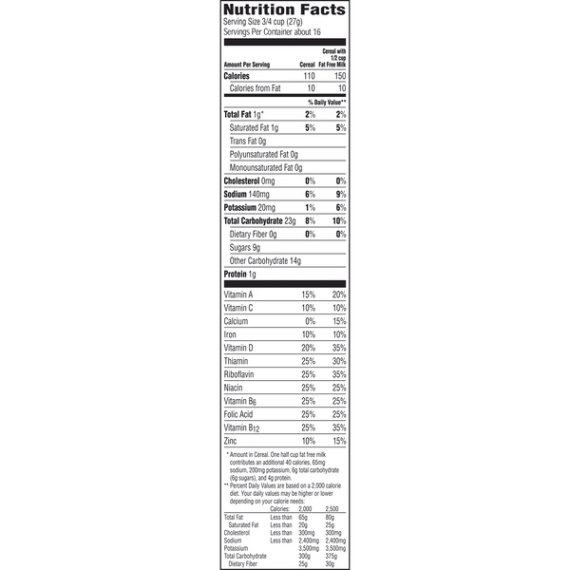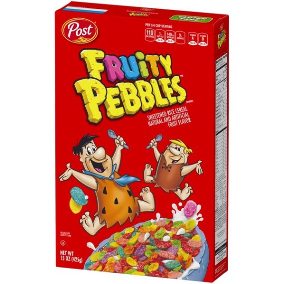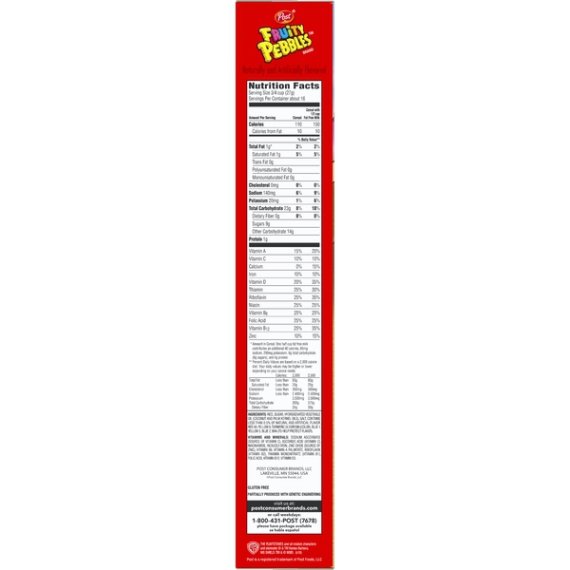 Details Ingredients RICE, SUGAR, HYDROGENATED VEGETABLE OIL (COCONUT AND PALM KERNEL OILS), SALT, CONTAINS LESS THAN 0.5% OF NATURAL AND ARTIFICIAL FLAVOR, RED 40, YELLOW 6, TURMERIC OLEORESIN (COLOR), BLUE 1, YELLOW 5, BLUE 2, BHA (TO HELP PROTECT FLAVOR). VITAMINS AND MINERALS: SODIUM ASCORBATE (SOURCE OF VITAMIN C), ASCORBIC ACID (VITAMIN C), NIACINAMIDE, REDUCED IRON, ZINC OXIDE (SOURCE OF ZINC), VITAMIN B6, VITAMIN A PALMITATE, RIBOFLAVIN (VITAMIN B2), THIAMIN MONONITRATE (VITAMIN B1), FOLIC ACID, VITAMIN B12, VITAMIN D3. Show more Product features Fruity Pebbles cereal is a sweetened crispy rice cereal with intense fruity flavor. With 11 Essential vitamins and minerals, every spoonful is...a blast of fruity awesome! Fruity Pebbles gluten free breakfast, with its delicious taste has been a family favorite for over 40 years! Post Consumer Brands make more of the top 50 cereal brands than any other company. The best cereal for kids and grown-ups alike. There’s a lot of tradition here, but also so much delicious invention. Cereal Sweetened rice cereal. Natural and artificial fruit flavor. Per 3/4 Cup Serving: 110 calories; 1 g sat fat (5% DV); 140 mg sodium (6% DV); 9 g sugars; vitamin A (15% DV); vitamin D (20% DV). Naturally and artificially flavored. Gluten free. Yabba dabba doo! Partially produced with genetic engineering. Carton made from 100% recycled paperboard. Minimum 35% post-consumer content. Visit us at: postconsumerbrands.com or call weekdays: 1-800-431-Post (7678). Please have package available. Special Features Family size Net Quantity of Content ABOUT 16 X 3/4 cup