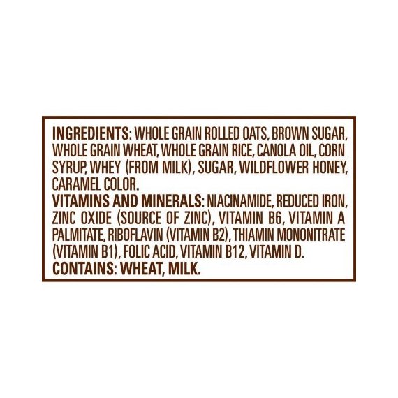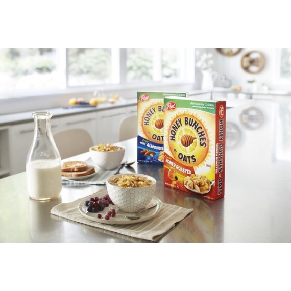 Details Ingredients CORN, WHOLE GRAIN WHEAT, SUGAR, WHOLE GRAIN ROLLED OATS, BROWN SUGAR, RICE, CANOLA OIL, WHEAT FLOUR, MALTED BARLEY FLOUR, CORN SYRUP, SALT, WHEY (FROM MILK), MALTED CORN AND BARLEY SYRUP, HONEY, CARAMEL COLOR, NATURAL AND ARTIFICIAL FLAVOR, ANNATTO EXTRACT (COLOR). BHT ADDED TO PACKAGING MATERIAL TO PRESERVE PRODUCT FRESHNESS. VITAMINS AND MINERALS: REDUCED IRON, NIACINAMIDE, VITAMIN B6, VITAMIN A PALMITATE, RIBOFLAVIN (VITAMIN B2), THIAMIN MONONITRATE (VITAMIN B1), ZINC OXIDE (SOURCE OF ZINC), FOLIC ACID, VITAMIN B12, VITAMIN D3. Show more Product features Honey Bunches of Oats cereal has just the right amount of crunch and flavor you need to nourish every smile. Honey Roasted breakfast cereal is the perfect combination of crispy flakes, crunchy oat clusters with a touch of honey. The original breakfast cereal that you can enjoy at any meal or as an on the go snack. Born in 1989, Honey Bunches of Oats hit the market and became an instant success. But, did you know it all started from a single smile? Loving father and lifelong Post employee, Vernon J. Herzing, had the idea to combine a few of Post's cereals together to make the ultimate tasty breakfast. With a little help from his daughter, he knew he was onto something the moment he saw her face light up with a smile. Over two decades later, Vernon's special cereal has made over 50,000,000 smiles, yours included. Spread your smile on our Facebook page and share what it is you love about Honey Bunches of Oats. Honey Bunches of Oats, Honey Roasted, 18 Oz no high fructose corn syrup contains 9 essential vitamins and minerals no cholesterol or trans fat kosher dairy low in fat touch of honey sweetness heart healthy 10g of whole grain per serving Post Honey Bunches of Oats https://www.facebook.com/honeybunchesofoats/ Special Features 0Mg cholesterol Net Quantity of Content ABOUT 17 X 3/4 cup