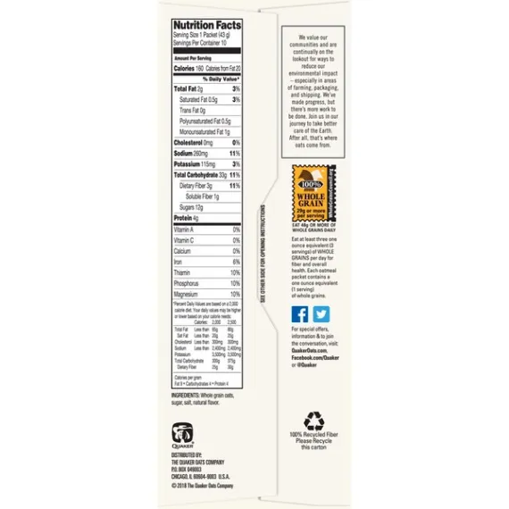 Details Ingredients WHOLE GRAIN OATS, SUGAR, SALT, NATURAL FLAVOR. Product features Includes 10 packets of Quaker Instant Oatmeal breakfast cereal Quaker Instant Oatmeal is made from 100% whole grain Quaker Oats Portable single-serving packets are easy to prepare and ready to eat in 90 seconds with the sweet taste of maple and brown sugar Heart healthy whole grains. Diets rich in whole grain foods and other plant foods and low in total fat, saturated fat, and cholesterol may reduce the risk of heart disease. Just think the wholesome goodness of Quaker Oats packed with the rich tastes of maple and brown sugar Instant Oatmeal in just 90 seconds! Savor the classic flavor of Quaker Instant Oatmeal Maple & Brown Sugar any time you want. Just because you've got a busy day doesn't mean you don't deserve all the goodness Quaker has to offer. Special Features Expertly milled Net Quantity of Content 10 X 43 g