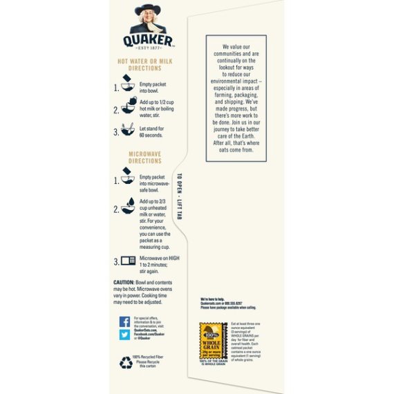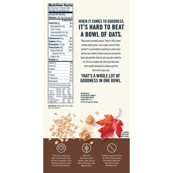 Details Ingredients WHOLE GRAIN OATS, SUGAR, SALT, NATURAL FLAVOR. Product features Includes 20 packets of Quaker Instant Oatmeal breakfast cereal Quaker Instant Oatmeal is made from 100% whole grain Quaker Oats Portable single-serving packets are easy to prepare and ready to eat in 90 seconds with the sweet taste of maple and brown sugar Heart healthy whole grains. Diets rich in whole grain foods and other plant foods and low in total fat, saturated fat, and cholesterol may reduce the risk of heart disease. Just think the wholesome goodness of Quaker Oats packed with the rich tastes of maple and brown sugar Instant Oatmeal in just 90 seconds! Savor the classic flavor of Quaker Instant Oatmeal Maple & Brown Sugar any time you want. Just because you've got a busy day doesn't mean you don't deserve all the goodness Quaker has to offer. Net Quantity of Content 20 X 43 g