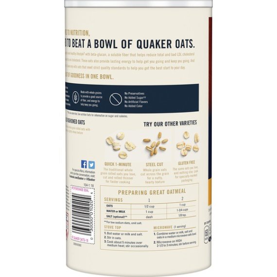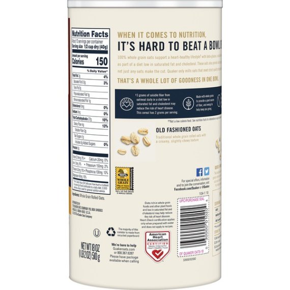 Details Ingredients 100 Natural Whole Grain Quaker Quality Rolled Oats Product features Old Fashioned Oatmeal, As part of a heart-healthy diet, the soluble fiber in Oatmeal can help reduce cholesterol 3 grams of soluble fiber from oatmeal daily in a diet low in saturated fat and cholesterol may reduce the risk of heart disease. This cereal has 2 grams per serving. Diets rich in whole grain foods and other plant foods and low in saturated fat and cholesterol may help reduce the risk of heart disease. Dive into a bowlful of hot, delicious Quaker Oatmeal. Throw in a few fresh berries, some toasted nuts, maple syrup or cinnamon. Just like the day itself, the possibilities are endless. Especially with the lasting energy from carefully selected, 100% natural whole grain oats. With energy to help get you going, fiber to help fill you up, and whole grains that can support heart health, Quaker Oatmeal gives you the start you want to take on the day. Quaker Oats Old Fashioned Oatmeal 18oz: Sodium Free 100% natural whole grain Kosher For toppings and recipe ideas, visit: www.quakeroats.com.Packing - Recyclable.The majority of this cannister is made from recycled paperboard 2015 The Quaker Oats Company Special Features 100% natural Net Quantity of Content 13 X 1/2 Cup Dry (40g)