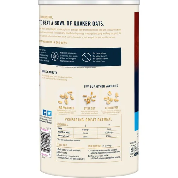 Details Ingredients Whole Grain Rolled Oats Product features Just because you don't have time for a relaxing breakfast doesn't mean you don't deserve the tasty benefits of Quaker Oats. Quick Quaker Oats give you all the wholesome goodness of Quaker in just one minute. Quaker Oats Quick 1 - Minute Oatmeal, 42 oz Special Features 100% natural Net Quantity of Content 30 X Cereal Alone½ Cup Dry (40g)