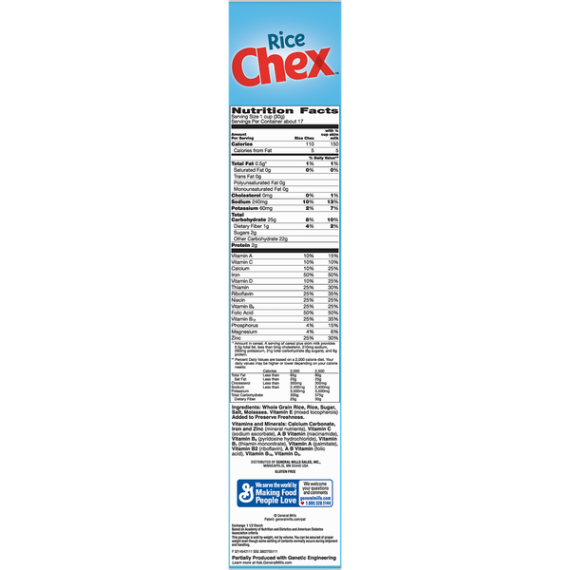 Details Ingredients Whole Grain Rice, Rice, Sugar, Salt, Molasses. Vitamin E (Mixed Tocopherols) Added to Preserve Freshness. Product features Whether it is breakfast time, snack time, or party time, Chex cereal has been delivering simple goodness for over 60 years. Rice Chex is Gluten Free, contains no high fructose corn syrup, no colors from artificial sources, no preservatives and no artificial flavors--and is a key ingredient in homemade Original Chex Party Mix, classic Muddy Buddies and hundreds of other easy recipes. So get munching, mixing and making--because inside each of these crunchy squares, you'll find a world of possibilities. For over 60 years, Chex cereal has been a part of kitchen pantries and family traditions. Those cute, crunchy Chex squares may look simple and straightforward. But if you take a closer look inside, you'll see every piece is a new place to dream, to play and to enjoy. Whether it's rice, corn or wheat, blueberry, honey nut, cinnamon, peanut butter or chocolate, each one is a blank canvas to let your imagination run wild. So grab a spoonful, handful or baggyful, and get to munching, mixing and making. Stir up your creativity and shake things up, at breakfast, snacktime, dessert and everywhere in between. Because inside each of these crunchy squares, you'll find a world of possibilities. EASY RECIPES: A go-to ingredient, Rice Chex shines in Original Chex™ Party Mix, Muddy Buddies and hundreds of other quick recipes. CEREAL: Wholesome breakfast that's a good source of calcium GLUTEN FREE CEREAL: Simply made with no artificial preservatives, colors, flavors or high fructose corn syrup WHOLE GRAIN: Made with 12 grams of whole grain rice per serving (At least 48 grams recommended daily) COLD CEREAL: Low sugar, Gluten Free cereal that's perfect for breakfast, snack time or anytime 13g of Whole Grain per Serving Cereal; Cold Cereal; Breakfast Cereal; Ready to Eat Cereal; Gluten Free; Gluten Free Cereal; Rice Cereal; Chex; Chex Cereal Special Features