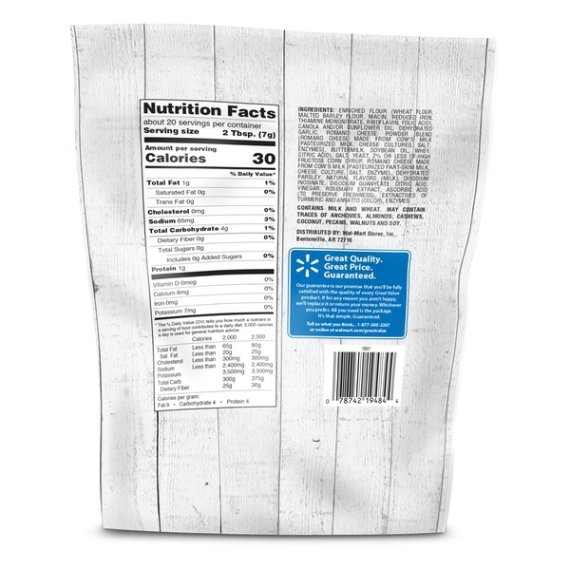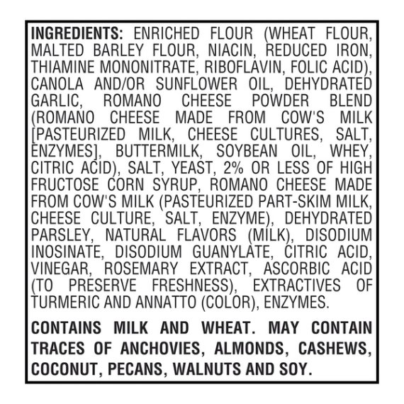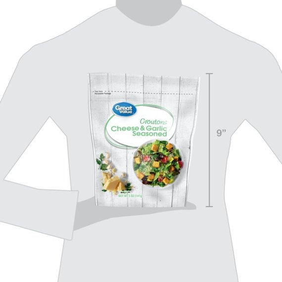 Details Ingredients ENRICHED FLOUR (WHEAT FLOUR, MALTED BARLEY FLOUR, NIACIN, REDUCED IRON, THIAMINE MONONITRATE, RIBOFLAVIN, FOLIC ACID), CANOLA AND/OR SUNFLOWER OIL, DEHYDRATED GARLIC, ROMANO CHEESE POWDER BLEND (ROMANO CHEESE MADE FROM COW'S MILK [PASTEURIZED MILK, CHEESE CULTURES, SALT, ENZYMES], BUTTERMILK, SOYBEAN OIL, WHEY, CITRIC ACID), SALT, YEAST, 2% OR LESS OF HIGH FRUCTOSE CORN SYRUP, ROMANO CHEESE MADE FROM COW'S MILK (PASTEURIZED PART-SKIM MILK, CHEESE CULTURE, SALT, ENZYME), DEHYDRATED PARSLEY, NATURAL FLAVORS (MILK), DISODIUM INOSINATE, DISODIUM GUANYLATE, CITRIC ACID, VINEGAR, ROSEMARY EXTRACT, ASCORBIC ACID (TO PRESERVE FRESHNESS), EXTRACTIVES OF TURMERIC AND ANNATTO (COLOR), ENZYMES. Show more Product features Spruce up dinner tonight with Great Value Cheese & Garlic Seasoned Croutons. These delicious croutons are oven baked to a wonderful golden brown and seasoned to perfection with a scrumptious blend of cheese, garlic, herbs and spices. Add them to your favorite salad recipe for a yummy crunch, top your favorite casseroles or macaroni and cheese, or use them to make tasty stuffing this Thanksgiving. They are packaged in a convenient, five-ounce resealable bag that helps maintain freshness after opening. With 20 servings per container these croutons can help spice up dinner for the whole family. Bring home and enjoy Great Value Cheese & Garlic Seasoned Croutons today! Great Value products provide families with affordable, high-quality grocery and household consumable options. With our wide range of product categories spanning grocery and household consumables, we offer you a variety of products for your family's needs. Our products are conveniently available online and in Walmart stores nationwide, allowing you to stock up and save money at the same time. Great Value Cheese & Garlic Seasoned Croutons, 5 oz: Oven baked to a wonderful golden brown and seasoned to perfection with a scrumptious blend of cheese, garlic, and spices Top salads, casseroles, and macaroni and cheese 20 servings per container Resealable bag to maintain freshness Net Quantity of Content ABOUT 20 X 7 g