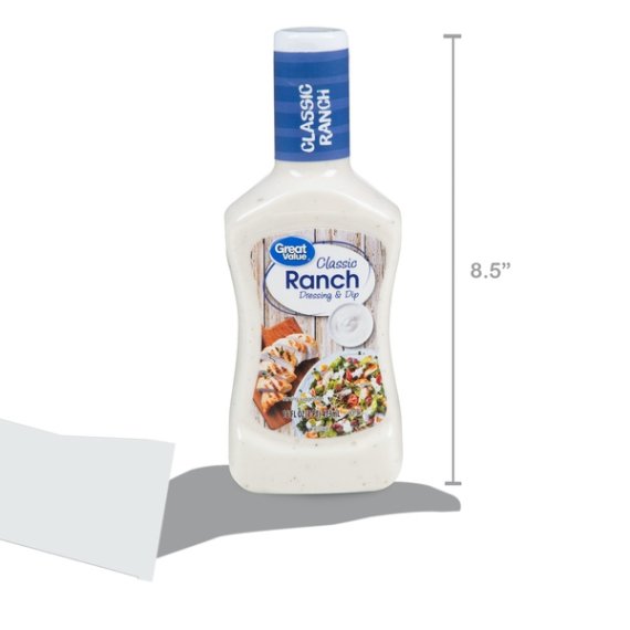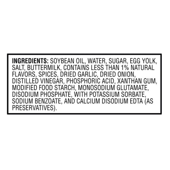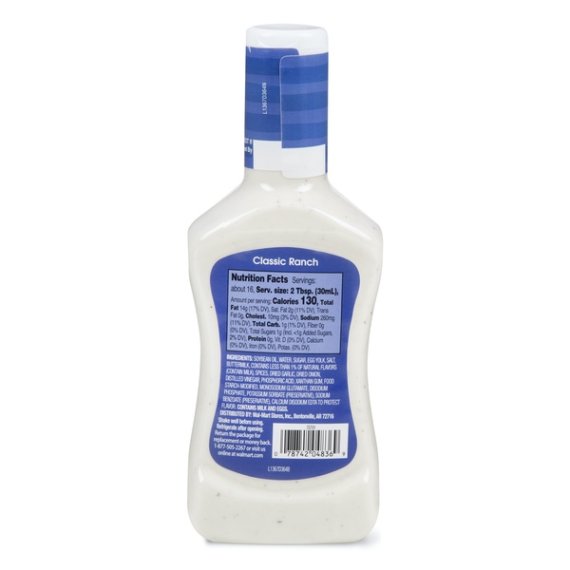 Details Ingredients Soybean Oil, Water, Sugar, Egg Yolk, Salt, Buttermilk, Contains Less Than 1% of Natural Flavors (Contain Milk), Spices, Dried Garlic, Dried Onion, Distilled Vinegar, Phosphoric Acid, Xanthan Gum, Food Starch-Modified, Monosodium Glutamate, Disodium Phosphate, Potassium Sorbate (Preservative), Sodium Benzoate (Preservative), Calcium Disodium EDTA To Protect Flavor. Show more Product features Great Value Classic Ranch Dressing and Dip is a thick and creamy condiment that is rich with wonderful flavor. This dressing is the perfect way to add some extra flavor to your favorite meals. Add to sandwiches, salads, burgers and wraps, or use as a dip with fries, chicken wings and pizza. Mix this dressing with hot sauce, cayenne pepper, chili pepper and chives to create a spicy dip your friends and family are sure to enjoy. Slice up your favorite veggies and serve with dressing for a refreshing snack you can savor at the office. This ranch is also great for recipes like chicken bacon ranch potato skins, bacon ranch pizza, zesty ranch slaw and much more. Enhance the flavors of your meals with a drizzle of Great Value Classic Ranch Dressing and Dip. Great Value products provide families with affordable, high quality grocery and household consumable options. With our wide range of product categories spanning grocery and household consumables, we offer you a variety of products for your family's needs. Our products are conveniently available online and in Walmart stores nationwide, allowing you to stock up and save money at the same time. Great Value Classic Ranch Dressing & Dip, 16 fl oz: Smooth and creamy ranch dressing Perfect for topping and dipping Kosher dairy 16 servings per container Net Quantity of Content 16 X 2 Tbsp. (30mL)