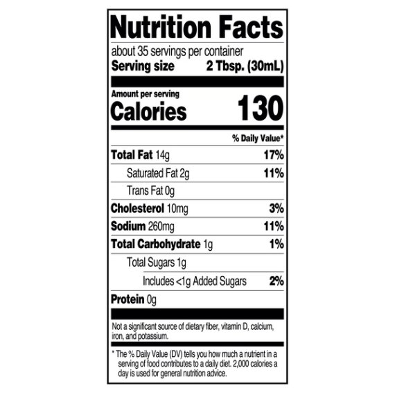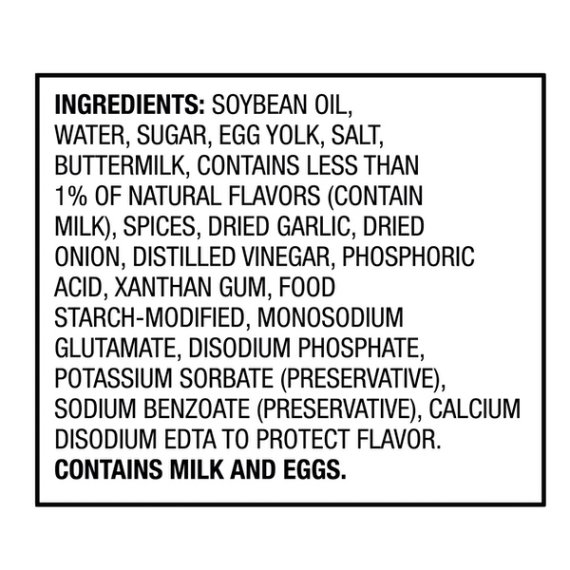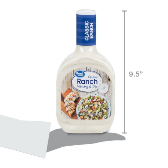 Details Ingredients Soybean Oil, Water, Sugar, Egg Yolk, Salt, Buttermilk, Contains Less Than 1% of Natural Flavors (Contain Milk), Spices, Dried Garlic, Dried Onion, Distilled Vinegar, Phosphoric Acid, Xanthan Gum, Food Starch-Modified, Monosodium Glutamate, Disodium Phosphate, Potassium Sorbate (Preservative), Sodium Benzoate (Preservative), Calcium Disodium EDTA To Protect Flavor. Show more Product features Great Value Classic Ranch Dressing and Dip is a thick and creamy condiment that is rich with wonderful flavor. This dressing is the perfect way to add some extra flavor to your favorite meals. Add to sandwiches, salads, burgers and wraps, or use as a dip with fries, chicken wings and pizza. Mix this dressing with hot sauce, cayenne pepper, chili pepper and chives to create a spicy dip your friends and family are sure to enjoy. Slice up your favorite veggies and serve with dressing for a refreshing snack you can savor at the office. This ranch is also great for recipes like chicken bacon ranch potato skins, bacon ranch pizza, zesty ranch slaw and much more. Enhance the flavors of your meals with a drizzle of Great Value Classic Ranch Dressing and Dip. Great Value products provide families with affordable, high quality grocery and household consumable options. With our wide range of product categories spanning grocery and household consumables, we offer you a variety of products for your family's needs. Our products are conveniently available online and in Walmart stores nationwide, allowing you to stock up and save money at the same time. Great Value Classic Ranch Dressing & Dip, 36 fl oz: Smooth and creamy ranch dressing Perfect for topping and dipping Kosher dairy 35 servings per container Net Quantity of Content 35 X 2 Tbsp. (30mL)