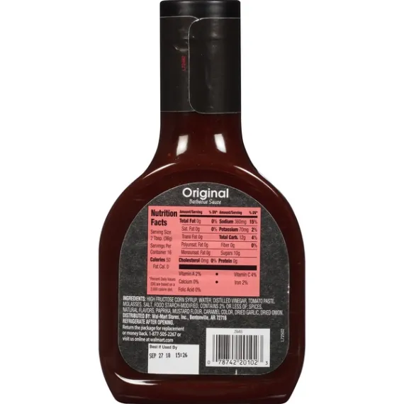 Details Ingredients High Fructose Corn Syrup, Water, Distilled Vinegar, Tomato Paste, Molasses, Salt, Food Starch-Modified, Contains 2% or less of: Spices, Natural Flavors, Paprika, Mustard Flour, Caramel Color, Dried Garlic, Dried Onion Show more Product features Great Value Original Barbecue Sauce is slow simmered with a delicious blend of spices and natural smoke flavor. This American classic is what you've been missing from your backyard summer cook outs. This BBQ sauce can be used in dozens of ways. Use it to marinate your pork or brisket, smother it on top of sandwiches and burgers or simply use it as a dipping sauce for some crispy chicken tenders. With over one pound of barbecue sauce, you will have plenty to last you time and time again. Add some flavor to your meals with Great Value Original Barbecue Sauce. Great Value products provide families with affordable, high quality grocery and household consumable options. With our wide range of product categories spanning grocery and household consumables, we offer you a variety of products for your family's needs. Our products are conveniently available online and in Walmart stores nationwide, allowing you to stock up and save money at the same time. Great Value Original Barbecue Sauce, 18 oz: Perfect on pork and brisket Traditional barbecue sauce Terrific dipping sauce Net weight 18 oz Net Quantity of Content 16 X 2 Tbsp. (36g)