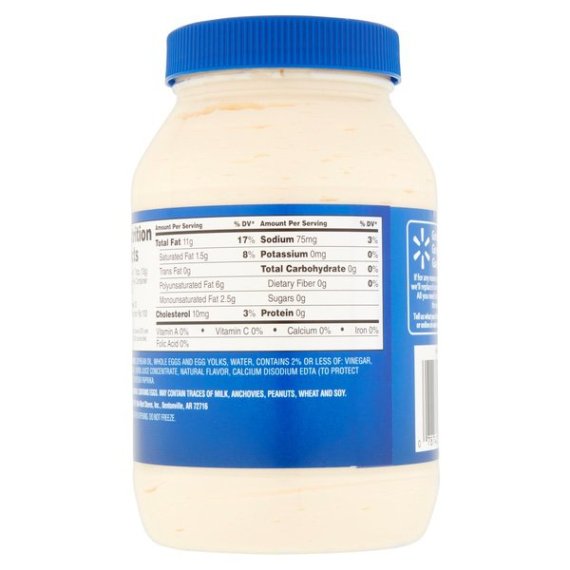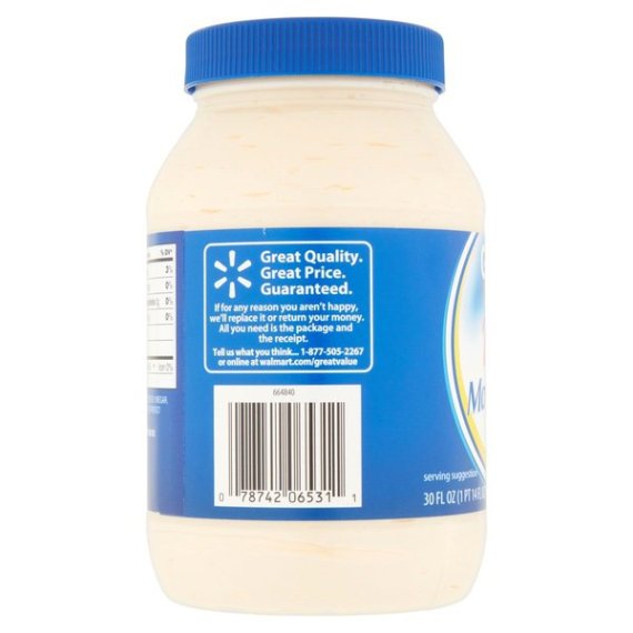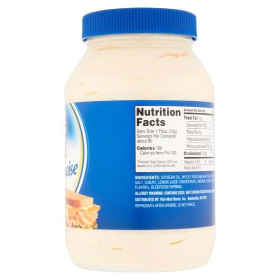 Details Ingredients SOYBEAN OIL, WHOLE EGGS AND EGG YOLKS, WATER, CONTAINS 2% OR LESS OF: VINEGAR, SALT, SUGAR, LEMON JUICE CONCENTRATE, NATURAL FLAVOR, CALCIUM DISODIUM EDTA (TO PROTECT FLAVOR), OLEORESIN PAPRIKA. Show more Product features Great Value Real Mayonnaise is a delicious condiment for a variety of foods. Spread it on sandwiches, burgers and more. It is also used as an ingredient in chicken salad and many other dishes. This jar contains 30 fl oz of kosher mayonnaise. Our guarantee is our promise that you'll be fully satisfied with the taste and quality of every Great Value product. If for any reason you aren't happy, we'll replace it or return your money. Whichever you prefer. All you need is the package and the receipt. It's that simple. Great quality. Great price. Guaranteed. Great Value Real Mayonnaise: Kosher Great Value mayonnaise contains no trans fats Net Quantity of Content ABOUT 60 X 1 Tbsp