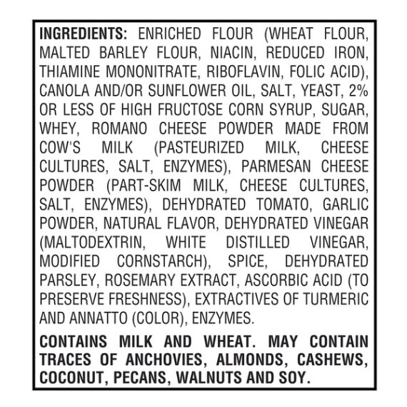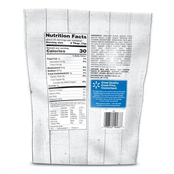 Details Ingredients ENRICHED FLOUR (WHEAT FLOUR, MALTED BARLEY FLOUR, NIACIN, REDUCED IRON, THIAMINE MONONITRATE, RIBOFLAVIN, FOLIC ACID), CANOLA AND/OR SUNFLOWER OIL (WITH ROSEMARY EXTRACT AND ASCORBIC ACID [TO PRESERVE FRESHNESS]), SUGAR, SALT, 2% OR LESS OF YEAST, WHEY, ROMANO CHEESE POWDER MADE FROM COW'S MILK (PASTEURIZED MILK, CHEESE CULTURES, SALT, ENZYMES), PARMESAN CHEESE POWDER (PART-SKIM MILK, CHEESE CULTURES, SALT, ENZYMES), DEHYDRATED TOMATO, GARLIC POWDER, NATURAL FLAVOR, VINEGAR POWDER (MALTODEXTRIN, WHITE DISTILLED VINEGAR, MODIFIED CORNSTARCH), SPICE, DEHYDRATED PARSLEY, EXTRACTIVES OF ANNATTO AND TURMERIC (COLOR), ENZYMES, ASCORBIC ACID. Show more Product features Spruce up dinner tonight with Great Value Seasoned Croutons. These delicious croutons are oven baked to a wonderful golden brown and seasoned to perfection with a scrumptious blend of herbs, cheese, and spices. Add them to your favorite salad recipe for a yummy crunch, top your favorite casseroles or macaroni and cheese, or use them to make tasty stuffing this Thanksgiving. They are packaged in a convenient, five-ounce resealable bag that helps maintain freshness after opening. With 20 servings per container these croutons can help spice up dinner for the whole family. Bring home and enjoy Great Value Seasoned Croutons today! Great Value products provide families with affordable, high-quality grocery and household consumable options. With our wide range of product categories spanning grocery and household consumables, we offer you a variety of products for your family's needs. Our products are conveniently available online and in Walmart stores nationwide, allowing you to stock up and save money at the same time. Great Value Seasoned Croutons, 5 oz: Oven baked to a wonderful golden brown and seasoned to perfection with a scrumptious blend of herbs, cheese, and spices Top salads, casseroles, and macaroni and cheese 20 servings per container Resealable bag to maintain freshness Net Quantity of Content ABOUT 20 X 7 g