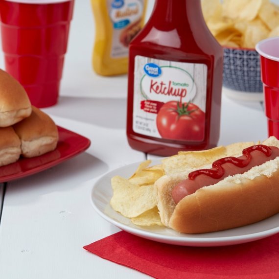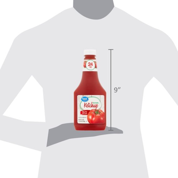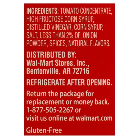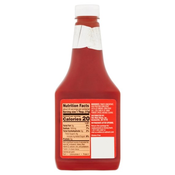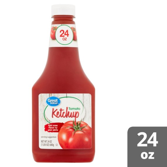 Details Ingredients TOMATO CONCENTRATE, HIGH FRUCTOSE CORN SYRUP, DISTILLED VINEGAR, CORN SYRUP, SALT, LESS THAN 2% OF: ONION POWDER, SPICES, NATURAL FLAVORS. Show more Product features Great Value Tomato Ketchup is proudly made with wholesome ingredients that create an irresistibly smooth texture that is perfect for many culinary creations. Our ketchup is made with natural tomatoes, choice seasonings and spices, and distilled vinegar. Use it as a dipping sauce for boardwalk fries or crispy chicken fingers, drizzle it on char-grilled hot dogs or juicy burgers, or add brown sugar and mustard to create a tangy barbeque sauce. Use Great Value Tomato Ketchup with your morning eggs, on your favorite corn dog, or with your sloppy joes. Our ketchup comes inside a reclosable squeeze bottle making it easy and convenient to dispense how much you want while keeping it fresh after every use. If you're looking for a classic condiment that has a mouthwatering taste, grab a bottle of Great Value Tomato Ketchup. Great Value products provide families with affordable, high quality grocery and household consumable options. With our wide range of product categories spanning grocery and household consumables, we offer you a variety of products for your family's needs. Our products are conveniently available online and in Walmart stores nationwide, allowing you to stock up and save money at the same time. Add some flavor to your plate Easy to dispense squeeze bottle Net weight 24oz Gluten-free Natural flavors 20 calories per serving Zero total fat Special Features 15 calories per serving Net Quantity of Content ABOUT 40 X 1 Tbsp
