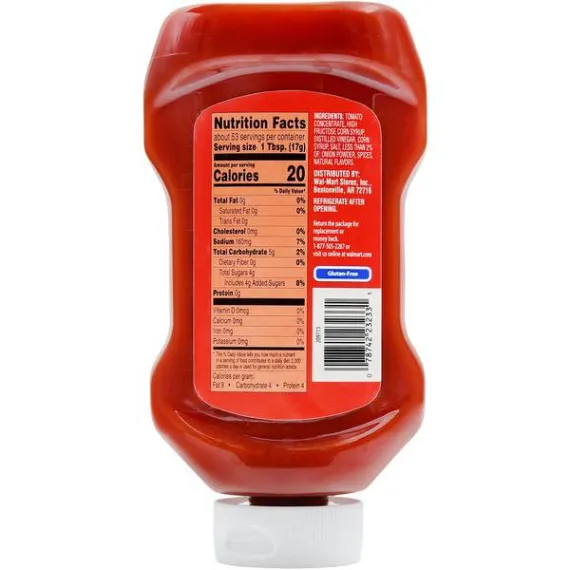 Details Ingredients Tomato Concentrate, High Fructose, Corn Syrup, Distilled Vinegar, Corn Syrup, Less than 25 of: Onion Powder, Spices, Natural Flavors. Product features Add flavor to your plate with Great Value Tomato Ketchup. Featuring a blend of tomatoes and herbs and spices, this ketchup is sure to make every bite delicious. This ketchup is perfect for adding to burgers, fries, hotdogs or homemade meatballs and meatloaf. Even make homemade barbecue sauce and spread on top of ribs, pulled pork sliders or beef brisket. Get ready for those summer barbecues by giving your guests great flavor with Great Value Tomato Ketchup. For your convenience this ketchup comes in a squeeze bottle, making it easy to spread the flavor without all the mess. With so many ways to savor, Great Value Tomato Ketchup is the perfect addition to your table. Great Value products provide families with affordable, high quality grocery and household consumable options. With our wide range of product categories spanning grocery and household consumables, we offer you a variety of products for your family's needs. Our products are conveniently available online and in Walmart stores nationwide, allowing you to stock up and save money at the same time. Great Value Tomato Ketchup, 32 oz: Gluten free Easy to use squeeze bottle to help prevent messes Great addition to burgers, fries, hotdogs, meatloaf and meatballs Perfect for summer barbecues Net Quantity of Content ABOUT 53 X 1 Tbsp