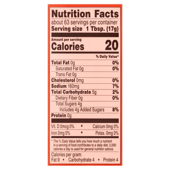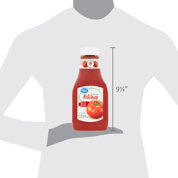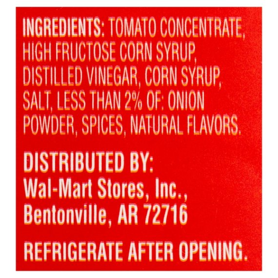 Details Ingredients TOMATO CONCENTRATE, HIGH FRUCTOSE CORN SYRUP, DISTILLED VINEGAR, CORN SYRUP, SALT, LESS THAN 2% OF: ONION POWDER, SPICES, NATURAL FLAVORS. Show more Product features Great Value Tomato Ketchup is proudly made with wholesome ingredients that create an irresistibly smooth texture that is perfect for many culinary creations. Our ketchup is made with natural tomatoes, choice seasonings and spices, and distilled vinegar. Use it as a dipping sauce for boardwalk fries or crispy chicken fingers, drizzle it on char-grilled hot dogs or juicy burgers, or add brown sugar and mustard to create a tangy barbeque sauce. Use Great Value Tomato Ketchup with your morning eggs, on your favorite corn dog, or with your sloppy joes. Our ketchup comes inside a reclosable squeeze bottle making it easy and convenient to dispense how much you want while keeping it fresh after every use. If you're looking for a classic condiment that has a mouthwatering taste, grab a bottle of Great Value Tomato Ketchup. Great Value products provide families with affordable, high quality grocery and household consumable options. With our wide range of product categories spanning grocery and household consumables, we offer you a variety of products for your family's needs. Our products are conveniently available online and in Walmart stores nationwide, allowing you to stock up and save money at the same time. Add some flavor to your plate Easy to dispense squeeze bottle Net weight 38oz Gluten-free Natural flavors 20 calories per serving Zero total fat Net Quantity of Content ABOUT 63 X 1 Tbsp