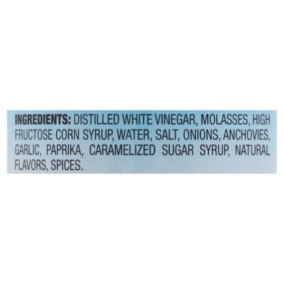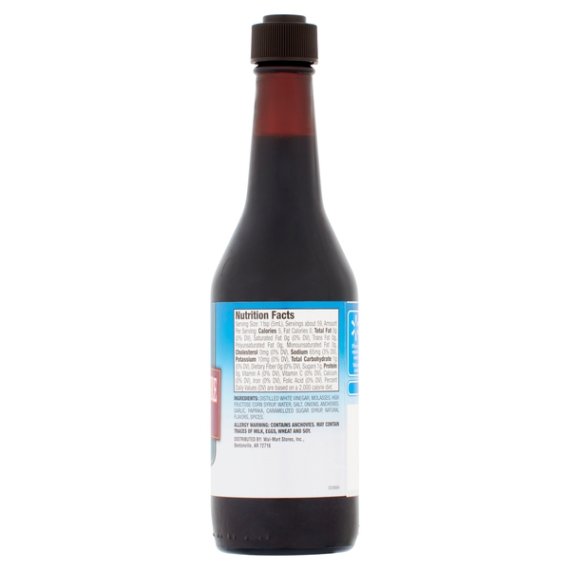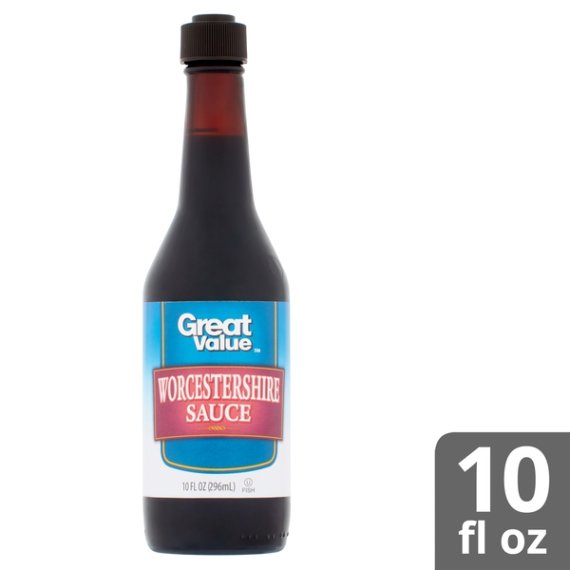 Details Ingredients DISTILLED WHITE VINEGAR, MOLASSES, HIGH FRUCTOSE CORN SYRUP, WATER, SALT, ONIONS, ANCHOVIES, GARLIC, PAPRIKA, CARAMELIZED SUGAR SYRUP, NATURAL FLAVORS, SPICES. Show more Product features Add strong, distinctive flavor to your home cooking with Great Value Worcestershire Sauce. This classic, flavor-enhancing sauce contains vinegar, molasses, garlic, paprika, and anchovies to liven up your dishes with a bold, meaty taste. Add a dash or two to sautéed vegetables to make them stand up well alongside your main course. If you're feeling adventurous, mix it into scrambled eggs for a zesty twist on your next breakfast. Include this sauce in stews, soups, and braised meats to bring out a variety of savory sensations. Great for steaks and chicken, and also handy for making other sauces, Worcestershire sauce is sure to add that extra something you've been looking for to impress your dinner guests. Try Great Value Worcestershire Sauce and bring out all of your favorite flavors in your recipes! Great Value products provide families with affordable, high quality grocery and household consumable options. With our wide range of product categories spanning grocery and household consumables, we offer you a variety of products for your family's needs. Our products are conveniently available online and in Walmart stores nationwide, allowing you to stock up and save money at the same time. 10Ounce per bottle Savory flavor enhancing sauce Includes vinegar, molasses, garlic, paprika, and anchovies 5 calories per serving Special Features Calories per serving Net Quantity of Content 59 X 1 tsp