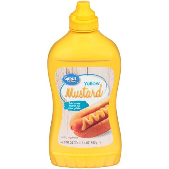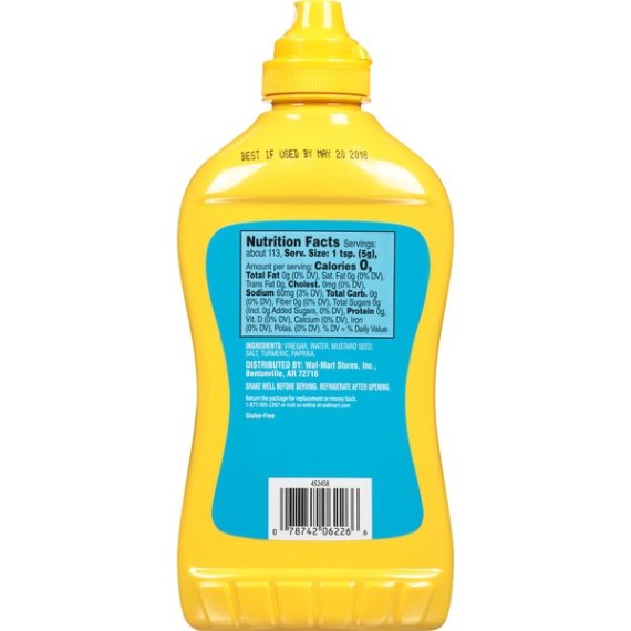 Details Ingredients Vinegar, Water, Mustard Seed, Salt, Turmeric, Paprika. Product features Great Value Yellow Mustard is a delicious topping for hamburgers, hot dogs and other favorite foods. You can also use it as an ingredient in sauces, glazes, stews, dressings and other dishes. This mustard comes in a convenient 20 oz squeezable bottle. Great Value Yellow Mustard will be a great addition to your next picnic or barbecue. Great Value products provide families with affordable, high quality grocery and household consumable options. With our wide range of product categories spanning grocery and household consumables, we offer you a variety of products for your family's needs. Our products are conveniently available online and in Walmart stores nationwide, allowing you to stock up and save money at the same time. Great Value Yellow Mustard, 20 oz: All natural mustard, 20 oz bottle Gluten-Free Ideal for use as a condiment on hot dogs, hamburgers, French fries and more Net Quantity of Content ABOUT 113 X 1 Tbsp