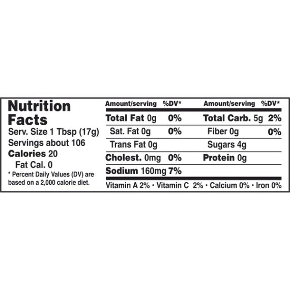 Details Ingredients Ingredients: Tomato Concentrate From Red Ripe Tomatoes, Distilled Vinegar, High Fructose Corn Syrup, Corn Syrup, Salt, Spice, Onion Powder, Natural Flavoring. Show more Product features Heinz Tomato Ketchup is made only from sweet, juicy, red ripe tomatoes for the signature thick and rich taste of Americas Favorite Ketchup. Only the best tomatoes for the best ketchup. Did you know that every tomato in every bottle of Heinz Ketchup is grown from Heinz seeds? Grown not made... One reason why no other ketchup taste like Heinz Ketchup! The thick texture makes this bottled ketchup perfect for spreading or dipping, and it's gluten free and great for those keeping Kosher to fit your preferences. Reach for this Kosher ketchup at every cookout to top your favorite burgers, hot dogs and sandwiches. Packed in large 64 ounce ketchup bottles for easy sharing, this condiment is your go-to option for gatherings and everyday meals. One 64 Ounce. bottle of Heinz Tomato Ketchup Heinz Tomato Ketchup uses sweet, juicy, ripe tomatoes grown from Heinz seeds for signature taste Rich ketchup made from the best tomatoes This tomato ketchup has a thick texture Contains gluten free ketchup to fit your preferences Special Features Fridge door fit Net Quantity of Content 106.0 X 1 Tbsp (17g)