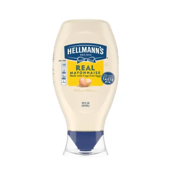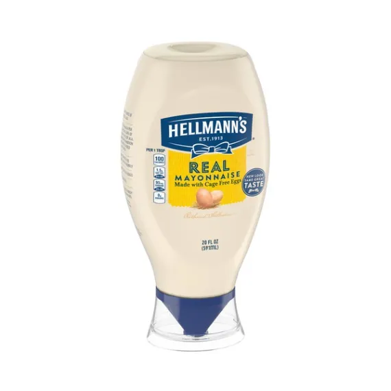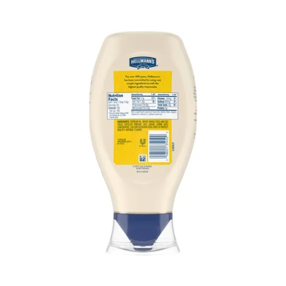 Details Ingredients Soybean Oil, Water, Whole Eggs And Egg Yolks, Vinegar, Salt, Sugar, Lemon Juice Concentrate, Calcium Disodium Edta (Used To Protect Quality), Natural Flavors. Show more Product features Hellmann's Real Mayonnaise is proudly made with real, simple ingredients like cage-free eggs, oil and vinegar. We know that to really "Bring Out The Best," we need to do more than just taste great. That’s why our delicious Blue Ribbon Quality Mayonnaise is made with real ingredients sourced from trusted American farms. Even after 100 years, we’re still committed to using premium ingredients to craft the highest quality mayonnaise. It's simple. We use the finest, real ingredients in Hellmann's Real. In fact, we use 100% cage-free eggs and are committed to 100% responsibly sourced soybean oil. Our authentic mayonnaise is rich in Omega 3-ALA (contains 650mg ALA per serving, which is 40% of the 1.6g Daily Value for ALA), and is also gluten-free and certified kosher. Hellmann’s unique squeeze bottle, with clean lock cap and precision tip, lets you squeeze with ease, and gives you the control to get your mayonnaise exactly where you want it. It’s the ideal condiment for spreading on sandwiches and wraps, grilling juicy burgers, mixing creamy dips, and preparing fresh salads. Use it to make outrageously juicy meals like our Parmesan Crusted Chicken and Best Ever Juicy Burger, and even turn your Thanksgiving leftovers into a deliciously creamy meal with our Turkey Casserole. Hellmann’s is known as Best Foods West of the Rockies. Discover our recipes, products, information about our sourcing, and more on our website, Hellmanns.com. Hellmann's Real Mayonnaise Squeeze 20 oz Enjoy the delicious creamy taste of Hellmann’s Real Mayonnaise in a convenient squeeze pack Hellmann’s unique squeeze bottle, with clean lock cap and precision tip, lets you squeeze with ease, and gives you the control to get your mayonnaise exactly where you want it Made with real, simple ingredients like 100% certified cage-free eggs, oil and vinegar This convenient pack is ideal for topping off your favorite sandwiches and barbecued burgers Rich in Omega 3-ALA (contains 650mg ALA per serving, which is 40% of the 1.6g Daily Value of ALA) Gluten Free and Kosher Net Quantity of Content 39 X 1 Tbsp