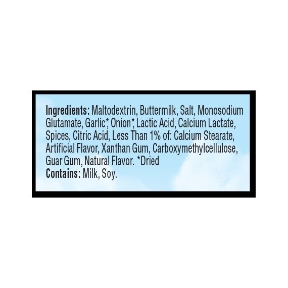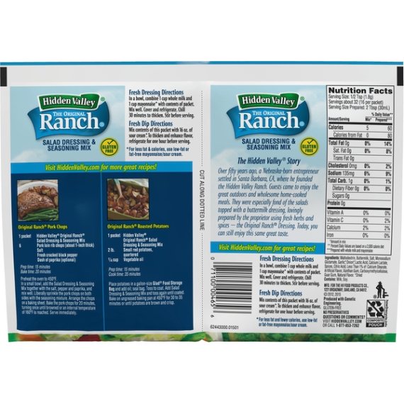 Details Ingredients Maltodextrin, buttermilk, salt, monosodium glutamate, dried garlic, dried onion, lactic acid, calcium lactate, spices, citric acid, less than 1% of: calcium stearate, artificial flavor, xanthan gum, carboxymethylcellulose, guar gum, natural flavor (soy). Contains: Milk, Soy. Show more Product features Spice up just about any meal with Hidden Valley Original Ranch Seasoning & Salad Dressing Mix. Whip up a quick salad dressing by stirring Seasoning & Salad Dressing Mix with milk and mayonnaise, and make a salad by tossing with mixed greens, pasta or potatoes. Make a zesty dip when you combine with sour cream, perfect with veggies, crackers or pretzels. Plus, add black pepper to Hidden Valley Original Ranch Seasoning & Salad Dressing Mix to create a black pepper rub for meats, or stir the dry mix into mashed potatoes to instantly upgrade your side dish. The possibilities are endless with Hidden Valley. ORIGINAL RANCH: With a creamy blend of herbs and spices, keep your friends and family wanting more with Hidden Valley Original Ranch Salad Dressing & Seasoning Mix made with no preservatives DIP & DRESSING: Create a zesty homemade dip when you combine with sour cream, perfect with veggies and crackers or combine with milk or mayonnaise for a delicious Ranch salad dressing SEASON: Sprinkle the dry mix like a seasoning over fish, meats, or potatoes to put a twist on everyday creations or family recipes GLUTEN FREE: Perfect for backyard BBQs and parties, this gluten free Ranch seasoning is as tasty as it is versatile - use it as an everyday condiment for burgers, sandwiches and wraps or as a salad topping QUICK & EASY: Use Hidden Valley Original Ranch Salad Dressing & Seasoning Mix as your weeknight secret weapon- add instant flavor to any meal the whole family will love Special Features No preservatives Net Quantity of Content ABOUT 32 X 2.0 Grams