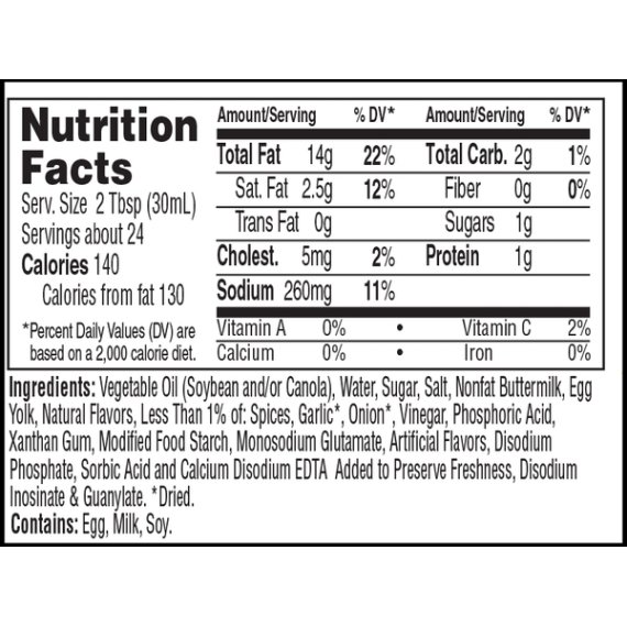 Details Ingredients Vegetable oil (soybean and/or canola), water, egg yolk, sugar, salt, cultured nonfat buttermilk, natural flavors (soy), less than 1% of: spices (mustard), dried garlic, dried onion, vinegar, phosphoric acid, xanthan gum, modified food starch, monosodium glutamate, artificial flavors, disodium phosphate, sorbic acid and calcium disodium edta as preservatives, disodium inosinate, disodium guanylate. Contains: Egg, Milk, Soy. Show more Product features Put together a quick, easy dinner anytime when you use Hidden Valley Original Ranch Dressing. Our Original Ranch Dressing makes it simple to get your daily dose of veggies. For delicious side dishes, mix with pasta or potatoes. Or toss with mixed greens and chopped tomatoes for an easy meal. Hidden Valley ranch dressing also makes a tasty addition to sandwiches, wraps and burgers, or as a dip with a vegetable tray, chips, or chicken strips. This gluten-free creamy ranch dressing is as versatile as it is tasty. • RANCH® DRESSING: Add Original Ranch dressing to more than just salads - add it to chicken or pasta as a flavorful topping for an easy, delicious meal, • GLUTEN FREE: Perfect for school lunches or backyard BBQs, this classic gluten free salad dressing is a crowd pleaser as America's #1 selling Ranch dressing, • SALAD DRESSING: Get your daily dose of veggies in a delicious way by adding Ranch as a salad topping or use as a classic veggie dip, • CONDIMENT: Use as a topper on burgers, sandwiches and wraps to refresh your meal prep or weeknight routine or as a dip with chips, pizza and chicken strips, • DINNER MADE EASY: Add instant flavor to your favorite salad, meal or side dish with a touch of creamy Hidden Valley Original Ranch Dressing Net Quantity of Content 24 X 30.0