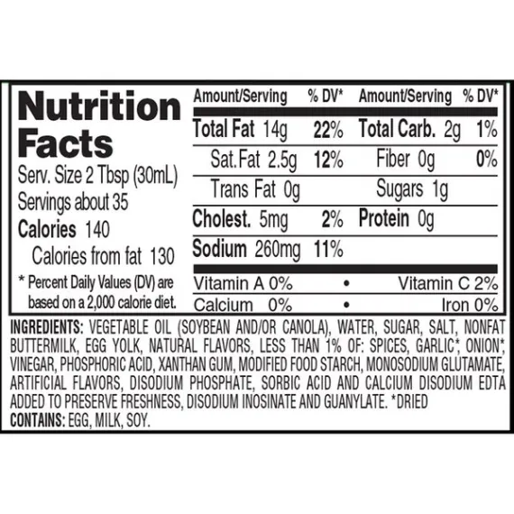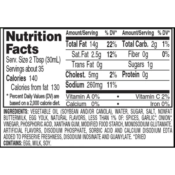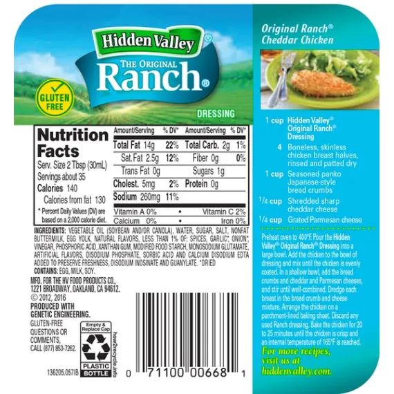 Details Ingredients Vegetable oil (soybean and/or canola), water, egg yolk, sugar, salt, cultured nonfat buttermilk, natural flavors (soy), less than 1% of: spices (mustard), dried garlic, dried onion, vinegar, phosphoric acid, xanthan gum, modified food starch, monosodium glutamate, artificial flavors, disodium phosphate, sorbic acid and calcium disodium edta as preservatives, disodium inosinate, disodium guanylate. Contains: Egg, Milk, Soy. Show more Product features Put together a quick, easy dinner anytime when youre stocked up with this two pack of Hidden Valley Original Ranch Dressing. Our Original Ranch Dressing makes it simple to get your daily dose of veggies. For delicious side dishes, mix with pasta or potatoes. Or toss with mixed greens and chopped tomatoes for an easy meal. Hidden Valley ranch dressing also makes a tasty addition to sandwiches, wraps and burgers, or as a dip with a vegetable tray, chips, or chicken strips. This gluten-free creamy ranch dressing is as versatile as it is tasty. RANCH DRESSING: Add Original Ranch dressing to more than just salads - add it to chicken or pasta as a flavorful topping for an easy, delicious meal GLUTEN FREE & KETO-FRIENDLY: Perfect for school lunches or backyard BBQs, this classic gluten free and keto-friendly salad dressing is a crowd pleaser as America's #1 selling Ranch dressing SALAD DRESSING: Get your daily dose of veggies in a delicious way by adding Ranch as a salad topping or use as a classic veggie dip CONDIMENT: Use as a topper on burgers, sandwiches and wraps to refresh your meal prep or weeknight routine or as a dip with chips, pizza and chicken strips DINNER MADE EASY: Add instant flavor to your favorite salad, meal or side dish with a touch of creamy Hidden Valley Original Ranch Dressing Net Quantity of Content ABOUT 35 X 30.0 Millilitres