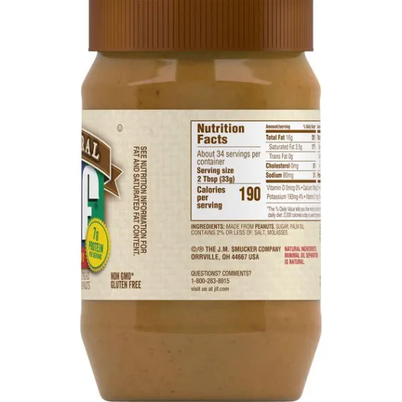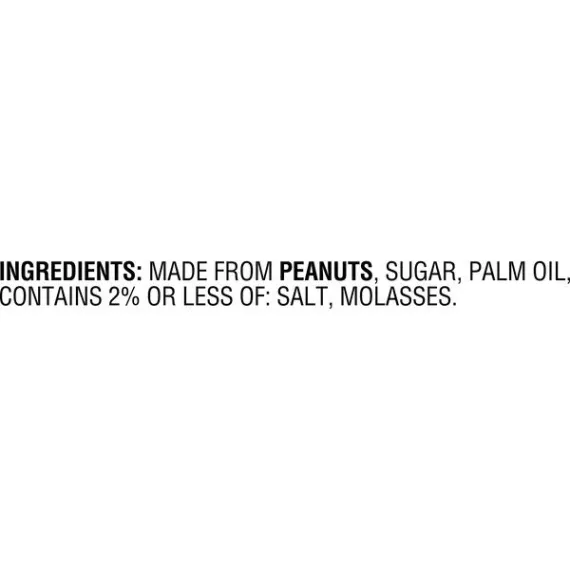 Details Ingredients Made From Peanuts, Sugar, Palm Oil, Contains 2% Or Less Of: Salt, Molasses. Product features Our Natural Creamy Peanut Butter Spread is made with five simple ingredients for a naturally delicious taste you’ll love. No stirring required! Low Sodium Fresh Roasted Peanut Taste Contains 90% Peanuts Net Quantity of Content 34.0 X 2 Tbsp