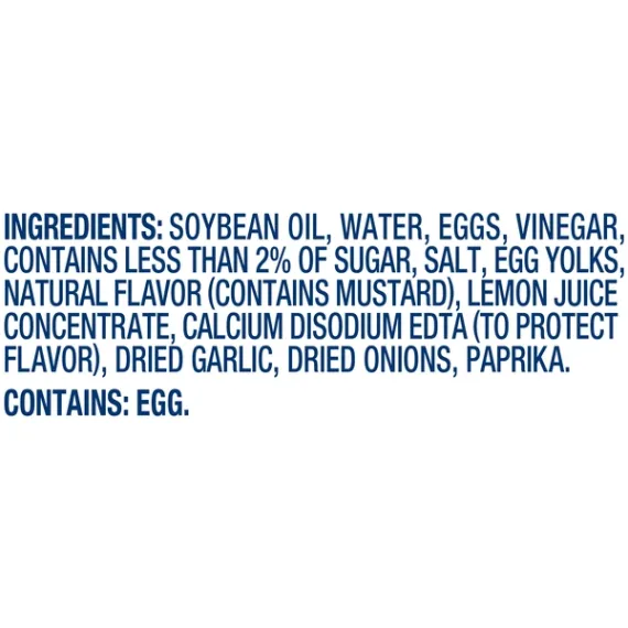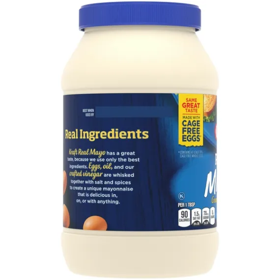 Details Ingredients Soybean Oil, Water, Eggs, Vinegar, Contains Less Than 2% Of Sugar, Salt, Egg Yolks, Natural Flavor (Contains Mustard), Lemon Juice Concentrate, Calcium Disodium Edta (To Protect Flavor), Dried Garlic, Dried Onions, Paprika. Contains: Egg. Show more Product features Kraft Real Mayo adds light flavor and creamy texture to all types of dishes. Made with cage free eggs, tangy vinegar, lemon juice and the perfect blend of seasonings, this family favorite mayonnaise delivers delicious flavor in every bite. This mayo is perfect for adding savory flavor to sandwiches, salads and more. Youll feel good about adding this real mayonnaise to all your favorite appetizers and entrees. You can also try adding this creamy Kraft mayo on sandwiches and hamburgers. This real mayonnaise is packaged in a resealable 30 ounce jar to help lock in flavor. Refrigerate after opening. One 30 oz. jar of Kraft Real Mayo Kraft Real Mayo is made with quality ingredients Real mayo has a light taste and creamy texture Mayonnaise has a light, creamy texture for easy spreading and dipping Made with cage free eggs Adds savory flavor to sandwiches, salads and more Packaged in a resealable jar Special Features Blue And turkey cafe cobb recipe included Net Quantity of Content 60.0 X 1 Tbsp (13g)