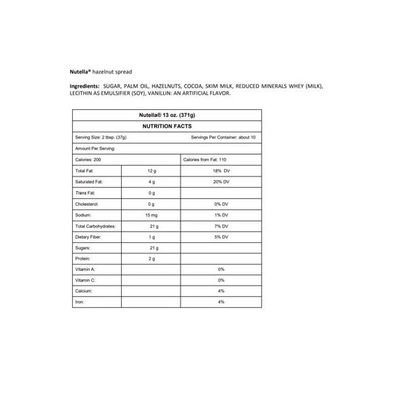 Details Ingredients Sugar, Palm Oil, Hazelnuts, Cocoa, Skim Milk, Whey (Milk), Lecithin As Emulsifier (Soy), Vanillin: An Artificial Flavor. Product features Nutella hazelnut spread is a happy start to every day! Order a jar of Nutella and enjoy it with whole wheat toast, waffles, pancakes, strawberries, bananas and many other foods. The original hazelnut chocolate spread made from a combination of roasted hazelnuts, skim milk, and a hint of cocoa Loved by both kids and adults No artificial Colors or Preservatives Gluten Free, Peanut Free, and Certified Kosher 13 Oz jar Special Features The original creamy, chocolaty hazelnut spread Net Quantity of Content 10 X 2 Tbsp. (37g)