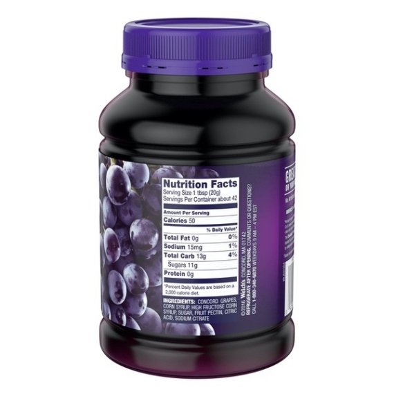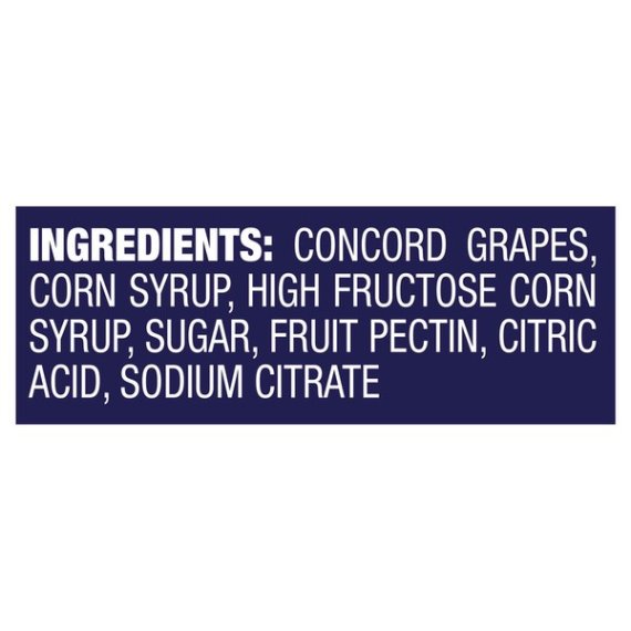 Details Ingredients CONCORD GRAPES, CORN SYRUP, HIGH FRUCTOSE CORN SYRUP,FRUIT PECTIN, CITRIC ACID, SODIUM CITRATE Product features Thereâs a reason Welchâs is Americaâs favorite grape jelly: Itâs the unmistakably bold, sweet flavor of Concord grapes straight off the vine. Every bottle and jar of Welch's Concord Grape Jelly contains the deliciously unmistakable fruit taste you've enjoyed for years. Never any artificial flavors or colors, because it tastes great without them! We make our jelly in the U.S.A. with Concord grapes, and 100% of our profits go to the family farmers who own Welchâs. AMERICA'S #1 GRAPE JELLY: Welch's Concord Grape Jelly is the deliciously unmistakable fruit taste you've enjoyed for years. AWARD-WINNING TASTE: Welch's Concord Grape Jelly is a recipient of the 2018 ChefsBest® Excellence Award, which is awarded to brands that surpass quality standards established by independent professional chefs. NO ARTIFICIAL FLAVORS OR COLORS: We never add any artificial flavors or colors to Welch's Concord Grape Jelly because it tastes great without them. PERFECT FOR PB&Js: The bold, sweet taste pairs perfectly with peanut butter for a classic peanut butter and jelly sandwich. Also great for cooking and baking. FARMER OWNED, FAMILY GROWN: Made with USA-grown grapes. 100% of profits go to the American family farmers who own Welch's. Net Quantity of Content ABOUT 42 X 20 g