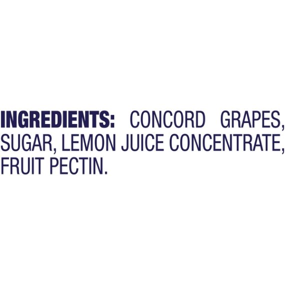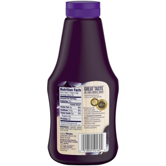 Details Ingredients CONCORD GRAPES, SUGAR, LEMON JUICE CONCENTRATE, FRUIT PECTIN Product features The ChefsBest® Excellence Award is awarded to brands that surpass quality standards established by independent professional chefs. FRESH-OFF-THE-VINE TASTE: Welch's Natural Concord Grape Spread packs the bold, delicious taste of Concord grapes into every bite. NO HIGH FRUCTOSE CORN SYRUP: Made with just four simple ingredients, and high fructose corn syrup isn't one of them. NO PRESERVATIVES, ARTIFICIAL FLAVORS OR COLORS: We never add any preservatives or artificial flavors or colors to Welch's Natural Concord Grape Spread because it tastes great without them. PERFECT FOR PB&Js: The bold, sweet taste pairs perfectly with peanut butter for a classic sandwich combo. Also great for cooking and baking. FARMER OWNED, FAMILY GROWN: 100% of profits go to the American family farmers who own Welch's. Net Quantity of Content ABOUT 28 X 18 g