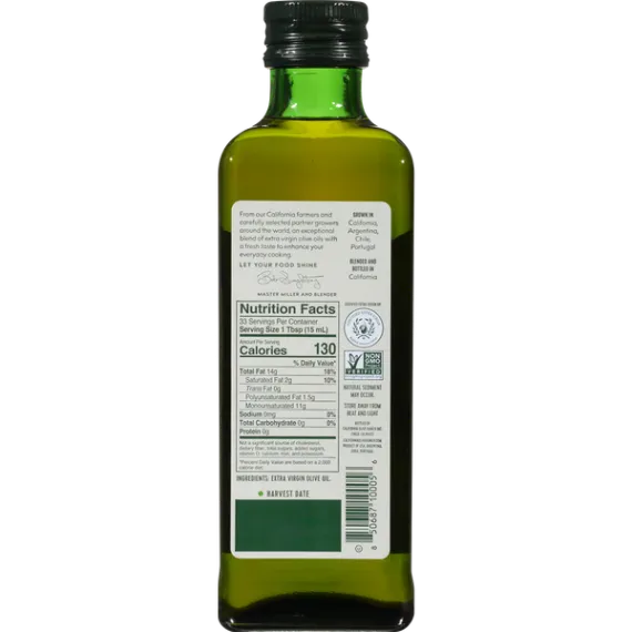 Details Ingredients Extra Virgin Olive Oil. Product features California Olive Ranch’s Everyday extra virgin olive oil is a great versatile oil to keep in your kitchen. It’s mild balanced flavor profile makes it a go-to oil for any cooking preparation. With notes of fresh herbs, fruit and green grass we recommend it for your everyday baking, sautéing and roasting. As part of the Destination Series line, this product features California extra virgin olive oil in partnership with extra virgin olive oil from hand-selected farms in Argentina, Portugal and Chile. All California Olive Ranch extra virgin olive oils must be free from any sensory flaws, must meet rigid chemical standards set by the Olive Oil Commission of California (OOCC), the strictest standards in the world, and be certified extra virgin by an independent third-party. Certified extra virgin First cold press Non-GMO Project Verified Perfect for everyday use Net Quantity of Content 33.0 X 1 Tbsp. (15mL)