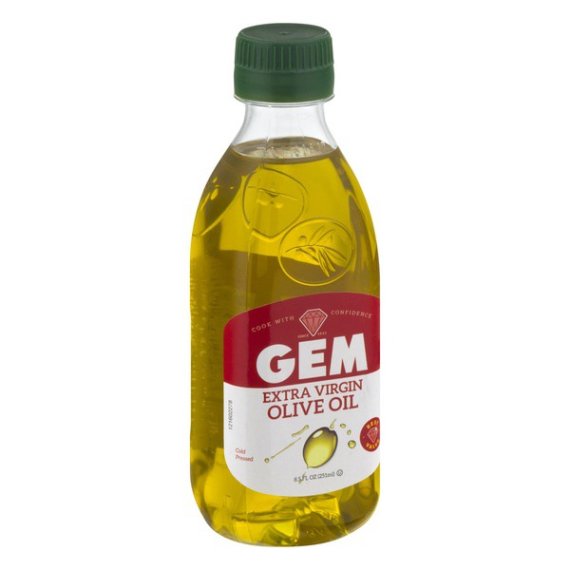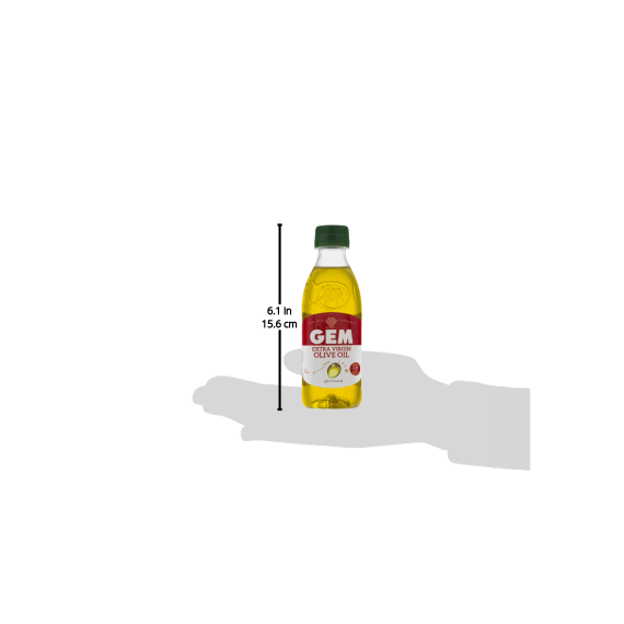 Details Ingredients EXTRA VIRGIN OLIVE OIL Product features Gem Extra Virgin Olive Oil adds consistent flavor to your everyday cooking with its selection of premium olives. Replace butter, margarine, and vegetable oil with our olive oil in your favorite recipes. Best for: Salad dressings, marinating, dipping, flavoring sauces, topping for pasta dishes, or use in grilling fish, poultry, and vegetables. Our oil is brought to you in the 8.5 oz. container for you to take your oil on the run, store easily, or if you are trying olive oil without making a big commitment on size or price. Gem Extra Virgin Olive Oil, For Seasoning and Finishing, Cold Pressed, 8.5 Ounces Ingredients: Select cold-pressed olive oil from Italy, Spain, Tunisia, Turkey, and Argentina Nutrition: Gem Olive Oil is rich in antioxidants and heart-healthy unsaturated fats. It naturally has no cholesterol, no trans-fats, no salt (sodium) and no carbohydrates. Shelf life: Store in a cool, dry place away from heat and light. Best used within six months after opening. We only offer Gem in the compact eight-and-a-half-ounce size to appeal to our customer. Ideas for Your Olive Oil: Use for skin benefits Dip your breads in it Give vegetables flavor Preserve food Add it to your smoothie in place of other fats such as yogurt or milk to get some of your healthy fats for the day Net Quantity of Content ABOUT 17 X 1 Tbsp